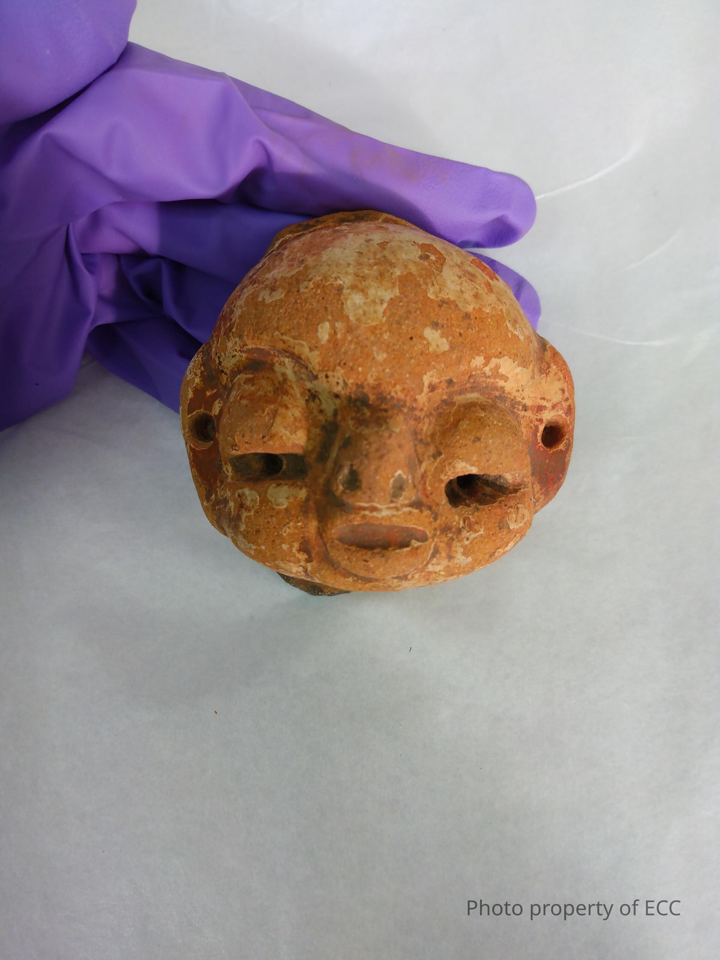 A carved head made out of rock or clay. The object is very round and has holes in it's ears, eyes, and the bottom of the chin.Collection
