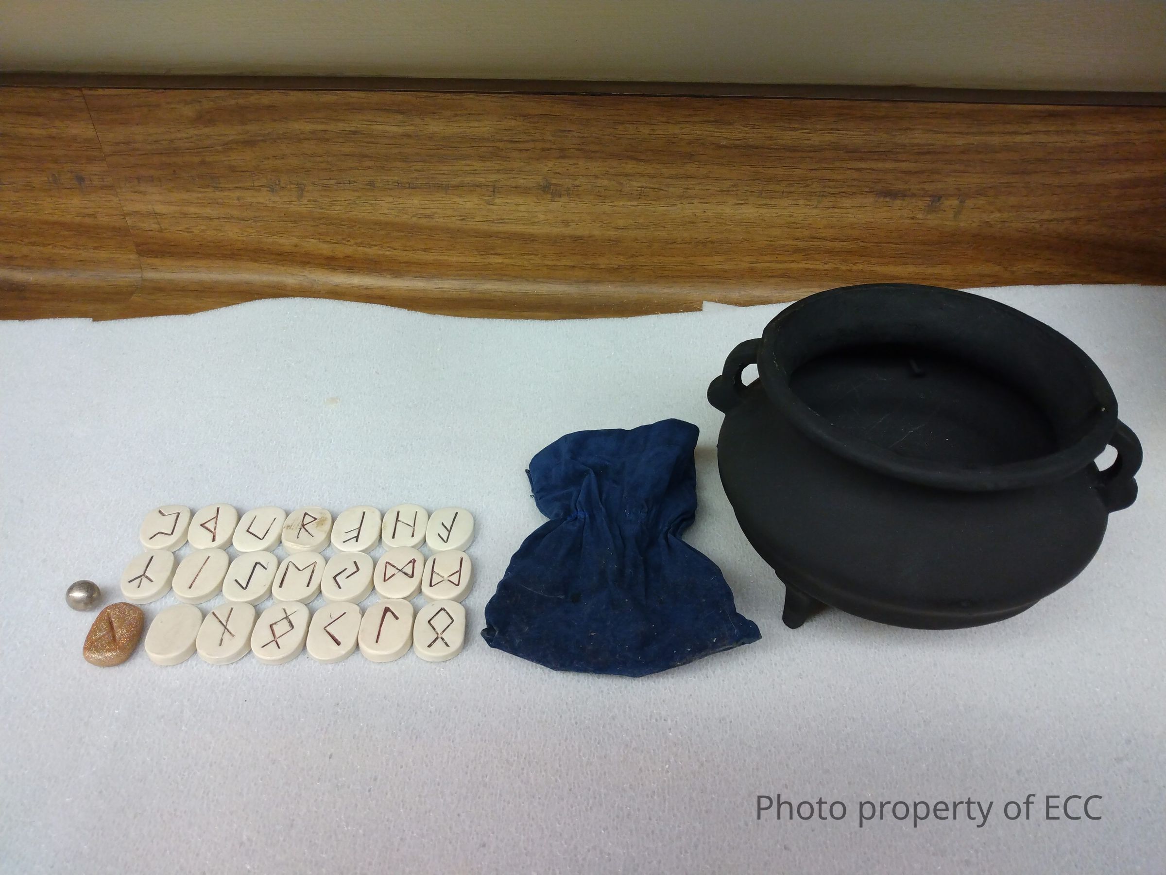 Object A, the cauldron is black on the inside and outside, heavy, has two side handles and three legs. There are a few scratches along the inside, a visible line on the inside, a circular opening and a bowl-shaped bottom. Object B is a collection of runes in a dark blue bag. There are 21 runes total, most of the runes (20) are a creme/white color. One of them is a glittery copper color. 20 of them have symbols except for a singular creme/white one. Some symbols resemble modern letters and others do not. Symbols are a brown color and an oval-like shape. Came with a metal ball and worn-out bag with a brown rubber band that is now replaced with string.Condition