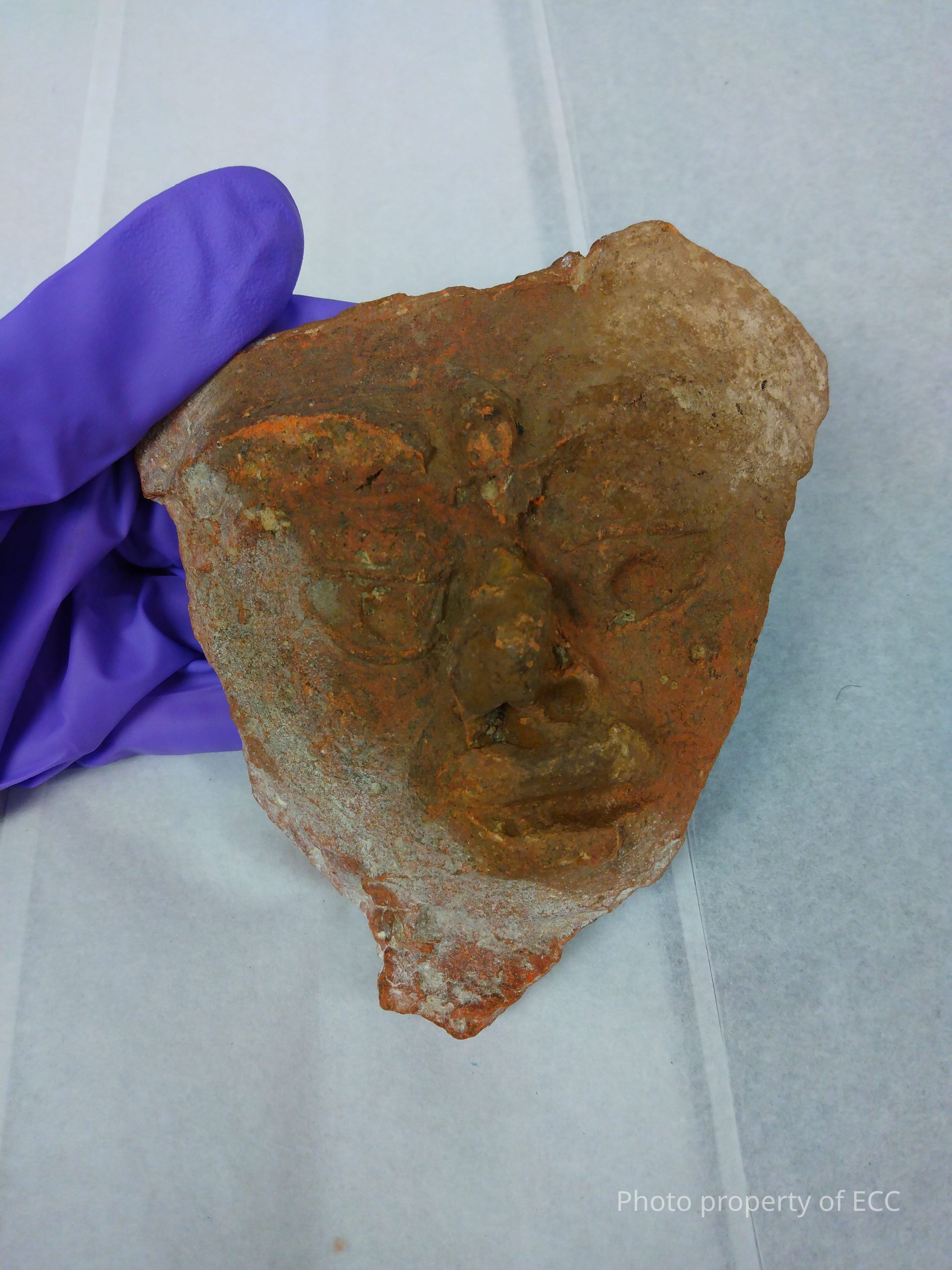 A fragmentary ceramic face, dated to c. 1200AD. The nose is damaged, and it had various chips along the edges, as well as some white substance on the back and along parts of the front.Collection