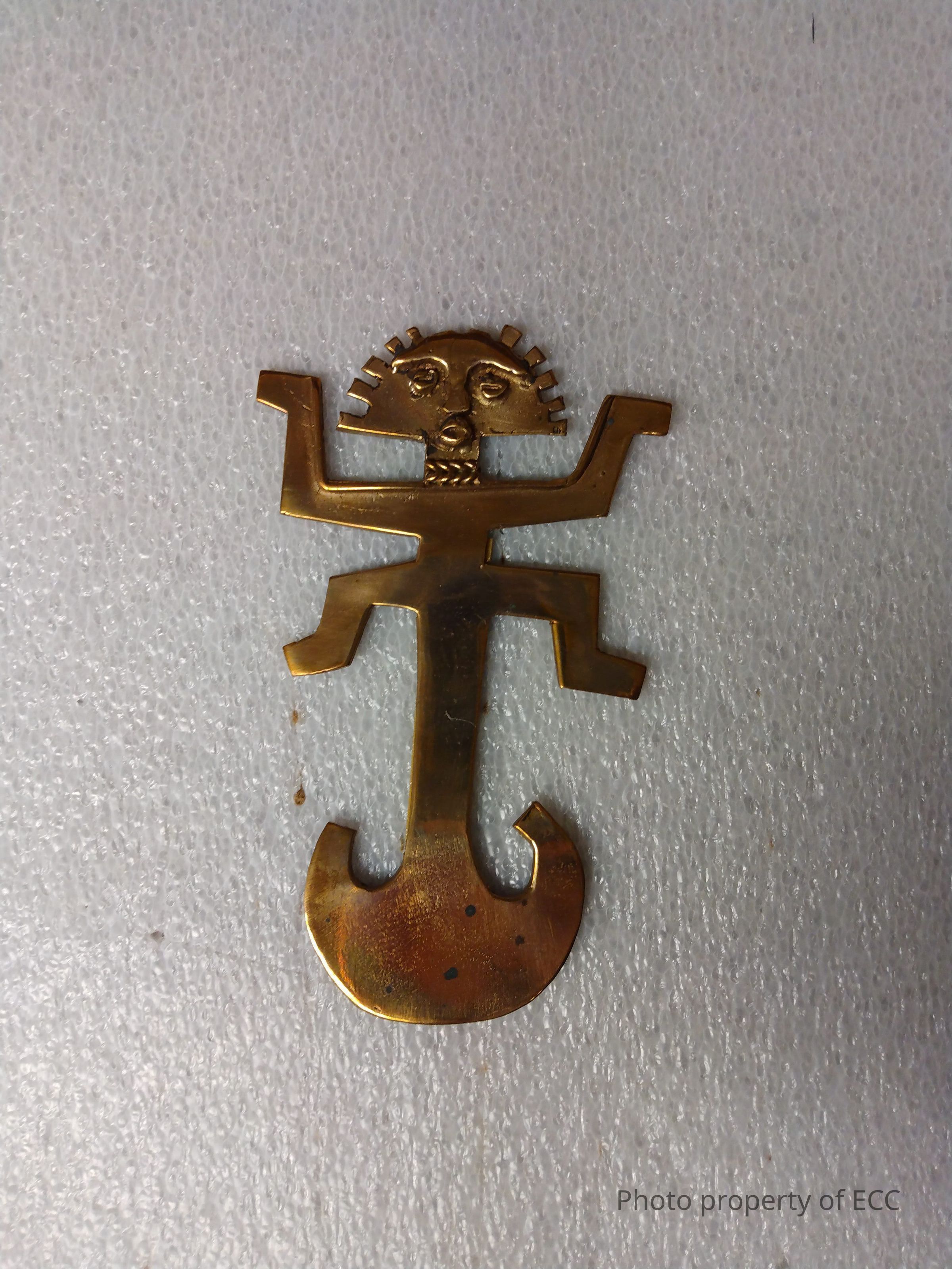 This ornament is gold in color, being made from the material goldite, and is in the shape of a sacrificial knife. The ornament's face has sun like rays around the head. In addition, the ornament has a braided necklace, four limbs point in different directions. The bottom is an upside-down umbrella shape.Item Type