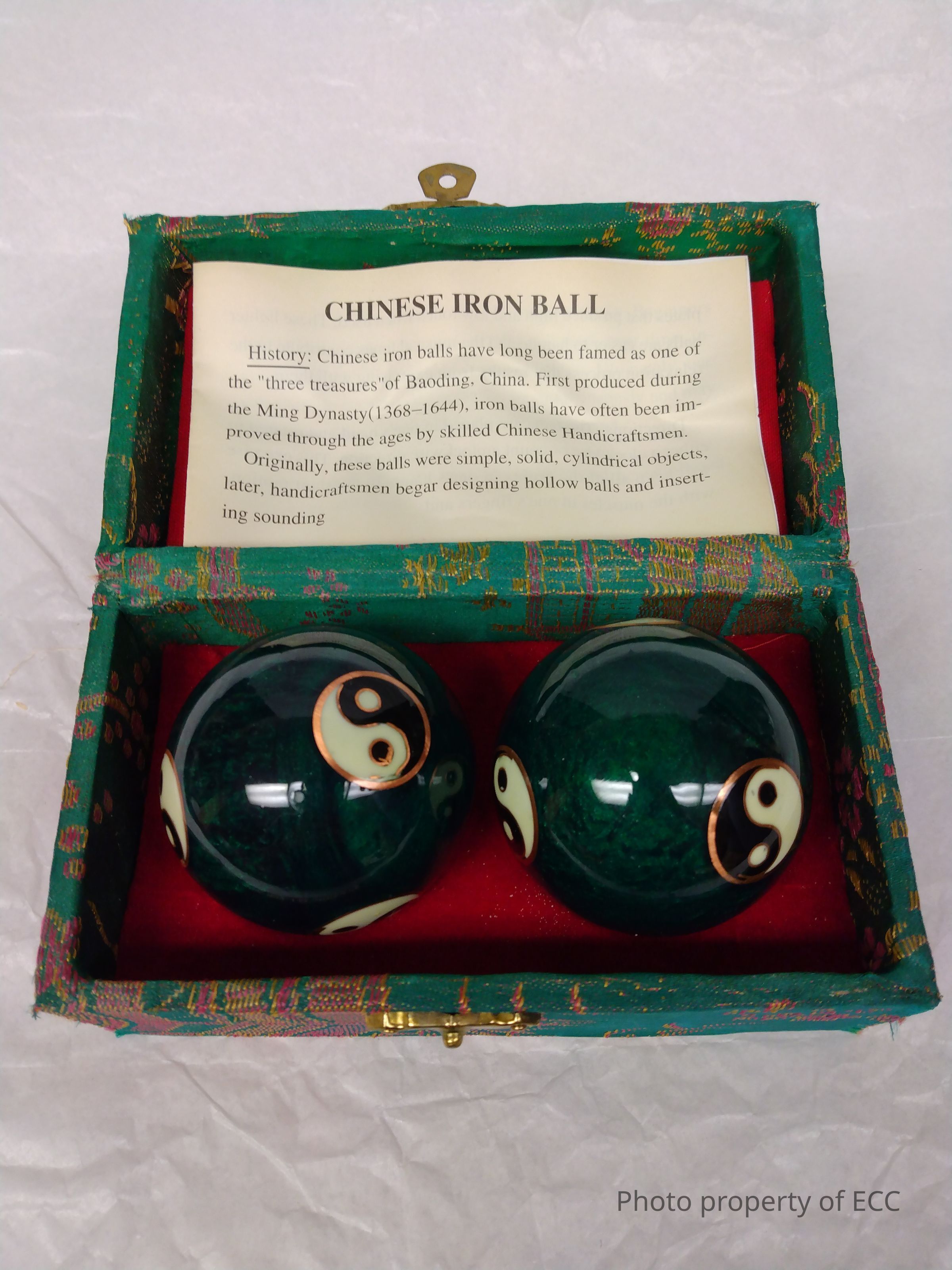 Two green hollow iron balls with sound. Yin and yang symbols are all around the ball. The box the balls came with includes notes explaining the history, directions, and maintenance. The box is a green, yellow and pink print embroidery. See link below for more info on this object!Collection