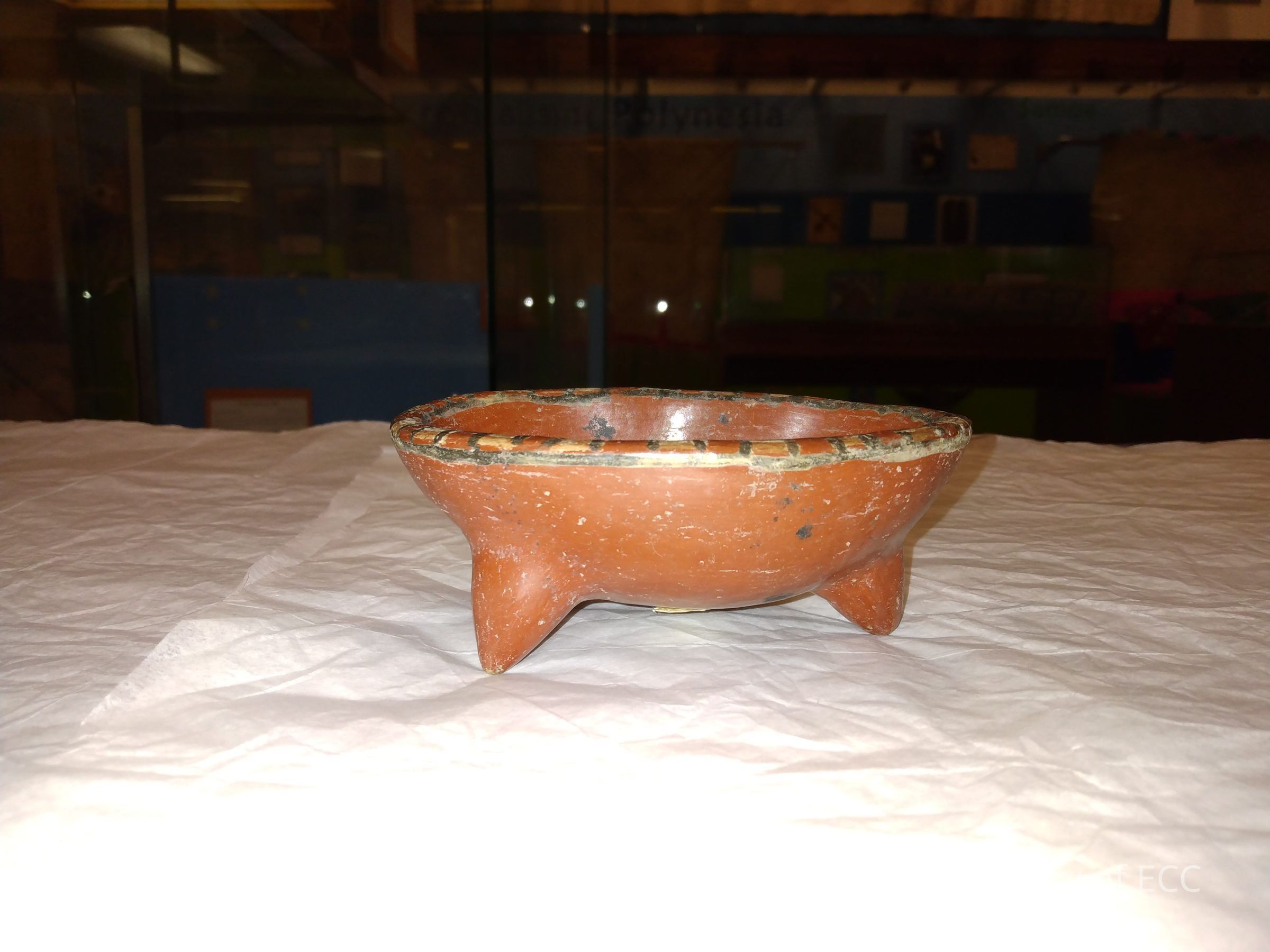 Red, black and tan kidney shaped bowl. Bowl had three legs, with various worn scuffs and black spots, perhaps fire clouds from initial firing. On the bottom is a small white adhesive sticker, labeled "A/2."Collection