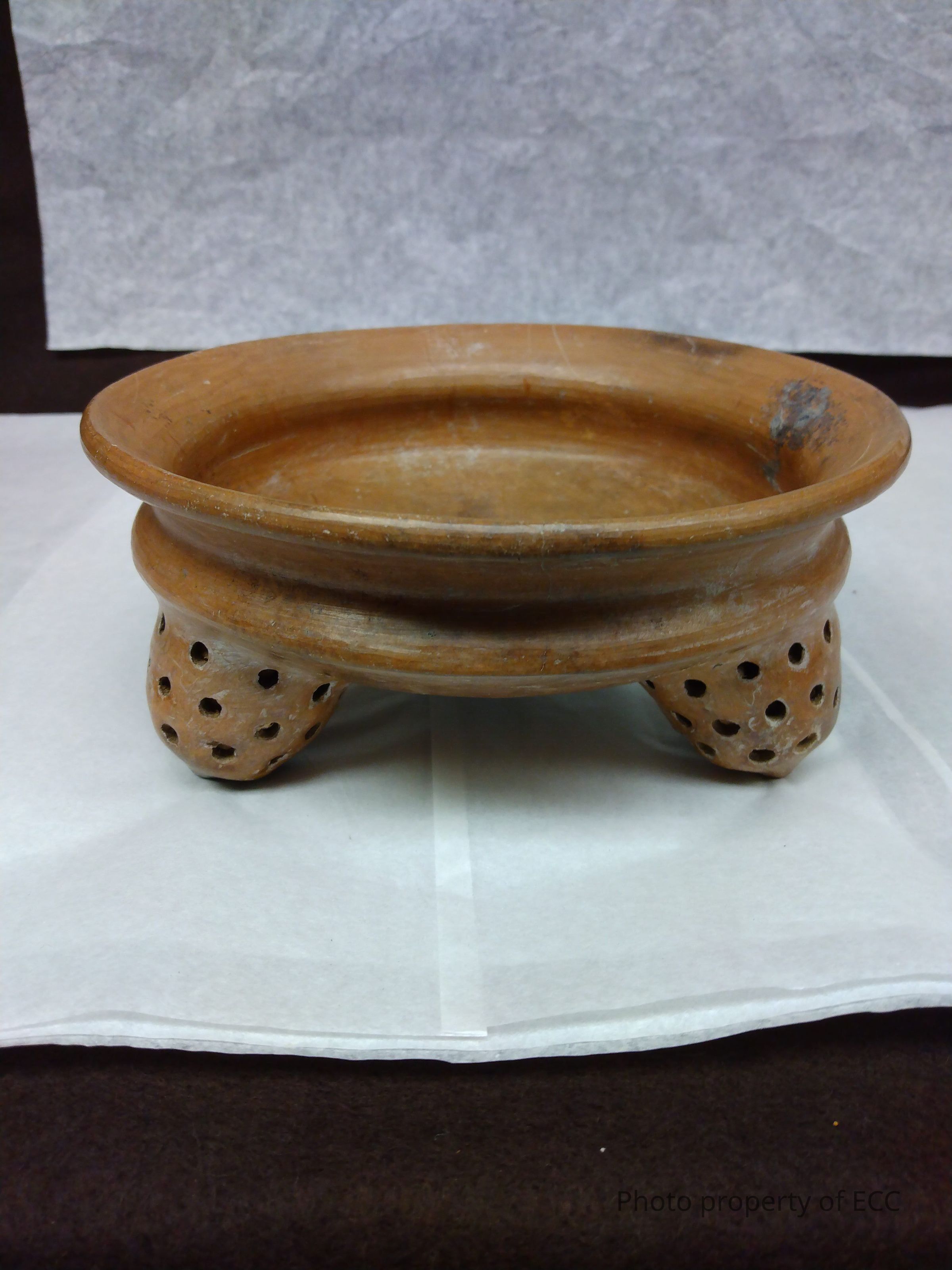 Black ware perforated-tripod bowl. A tripod bowl, its three legs are "mammary" shaped and are rattles. Some staining is visible on the inside of the bowl, as well as on the bottom, from an unknown substance. A black fire cloud is visible on one leg as well as on the edges of the bowl.Collection
