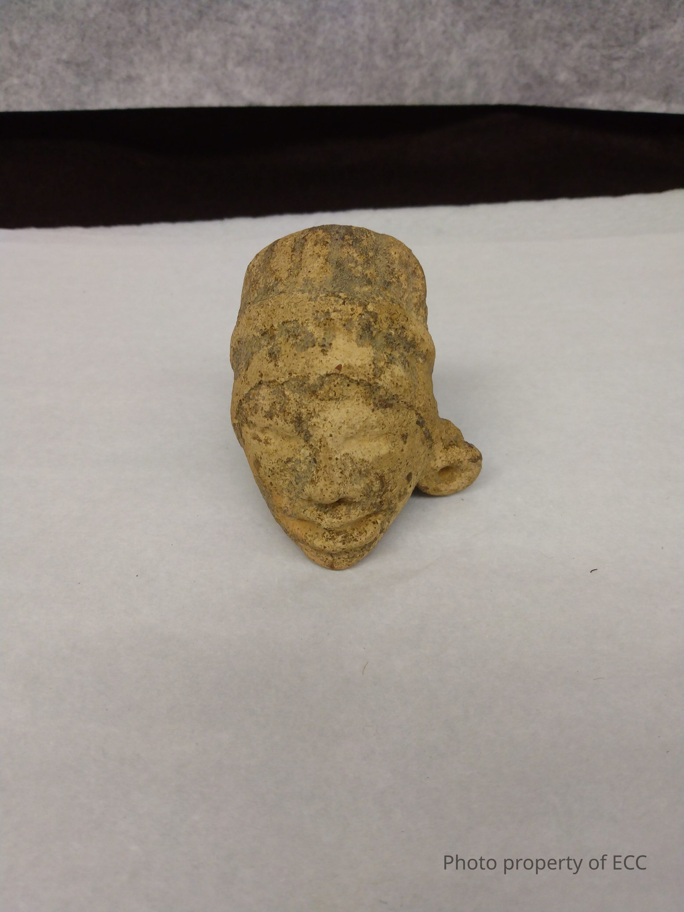 Mayan Clay Head. Figure appears to be wearing a headdress. Variations in surface probably due to age. Light brown and dark brown in color.Collection