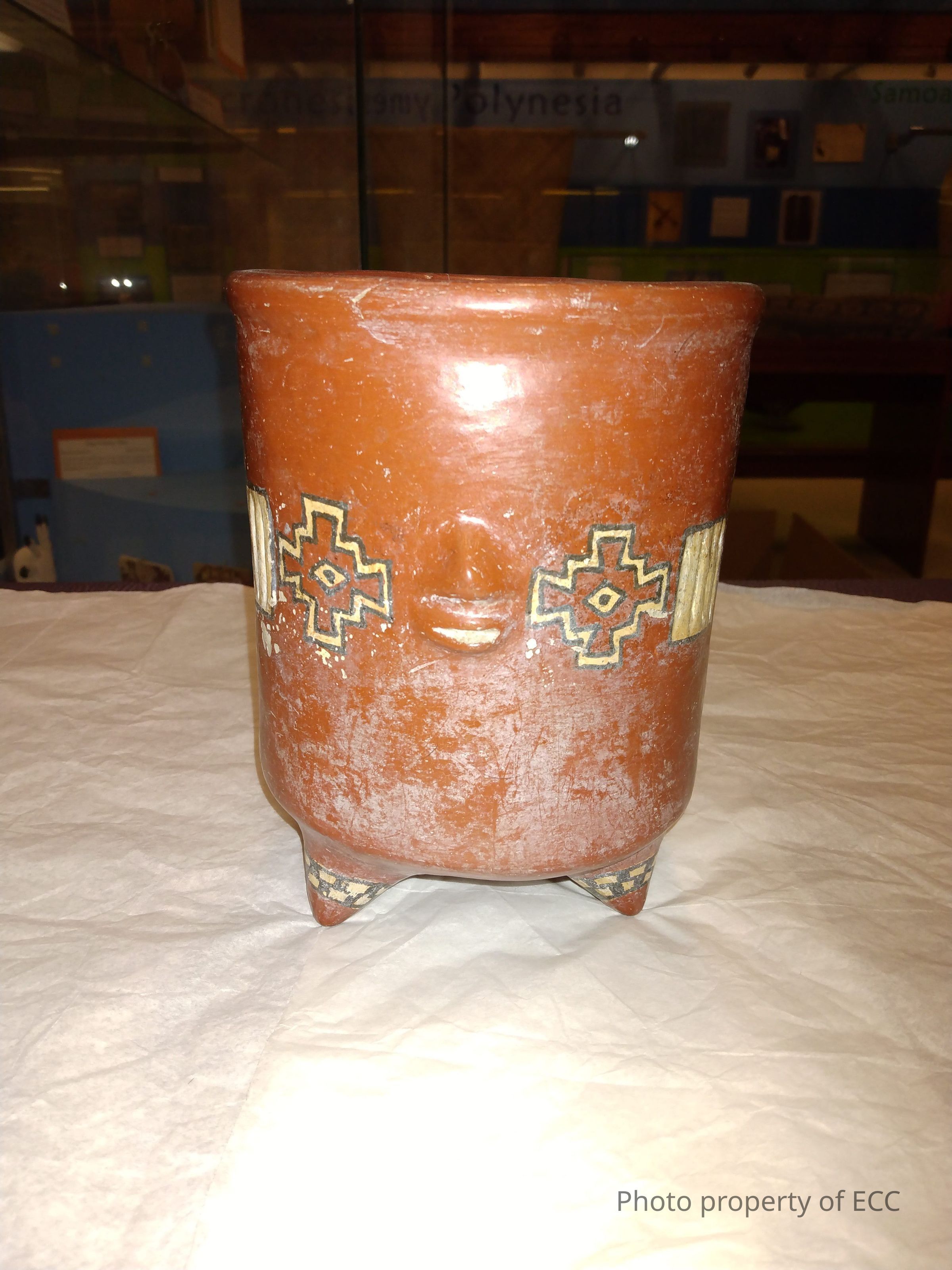 A cylindrical, tripod red, black and tan polychrome effigy pot. It has various geometrical designs with impressed decorations on the legs and body. The impressed decorations look like a nose and mouth, with two geometrical designs on either side, representing eyes.Collection