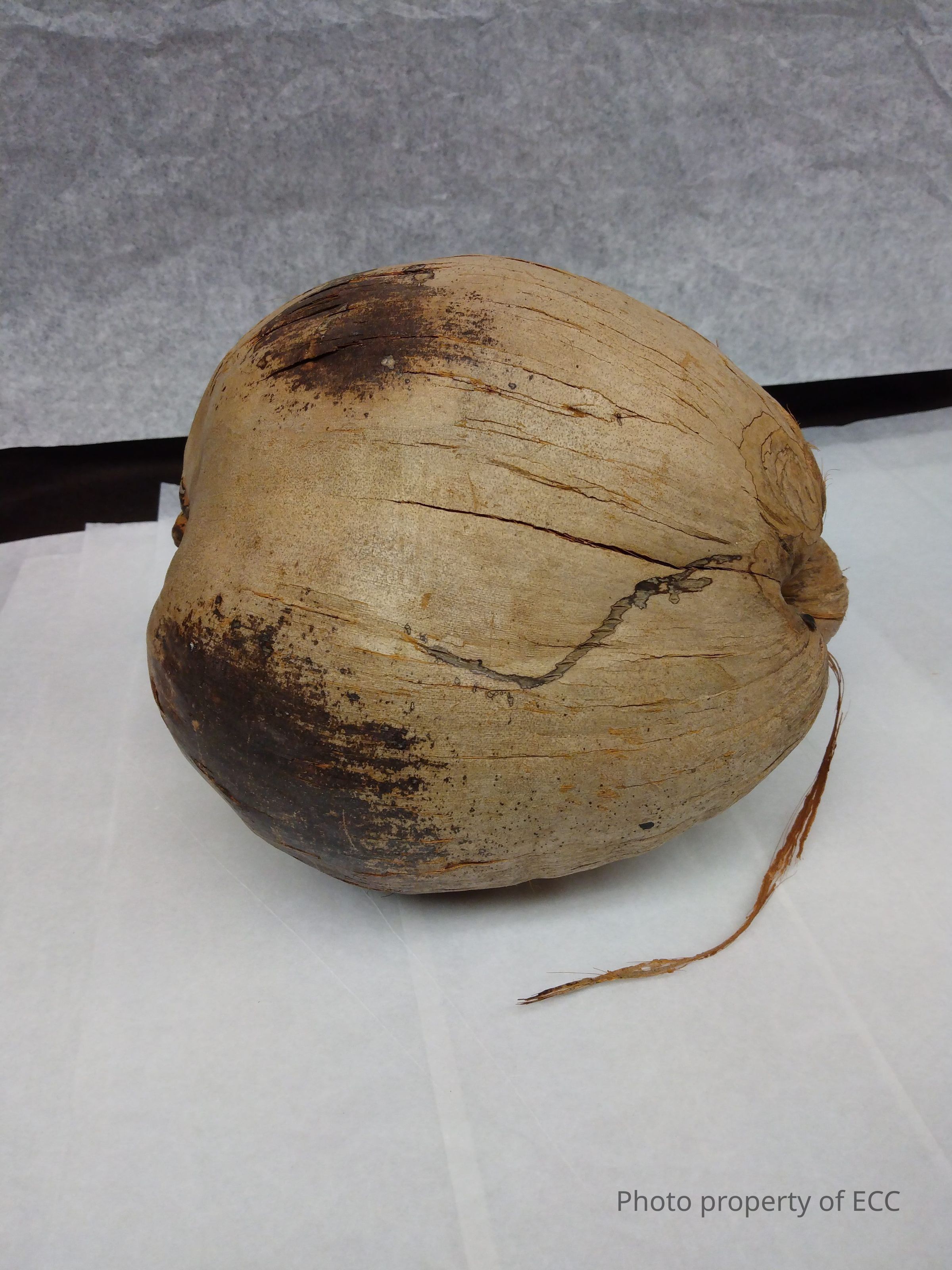 A decently sized coconut. It is tan in color with large to medium dark brown spots throughout the surface. The ends of the coconut differ from each other. One side tucked in while the other is pointing outward. There are various line cracks throughout, causing the fibers to be visible. When lightly shaken, something rattles inside.Collection