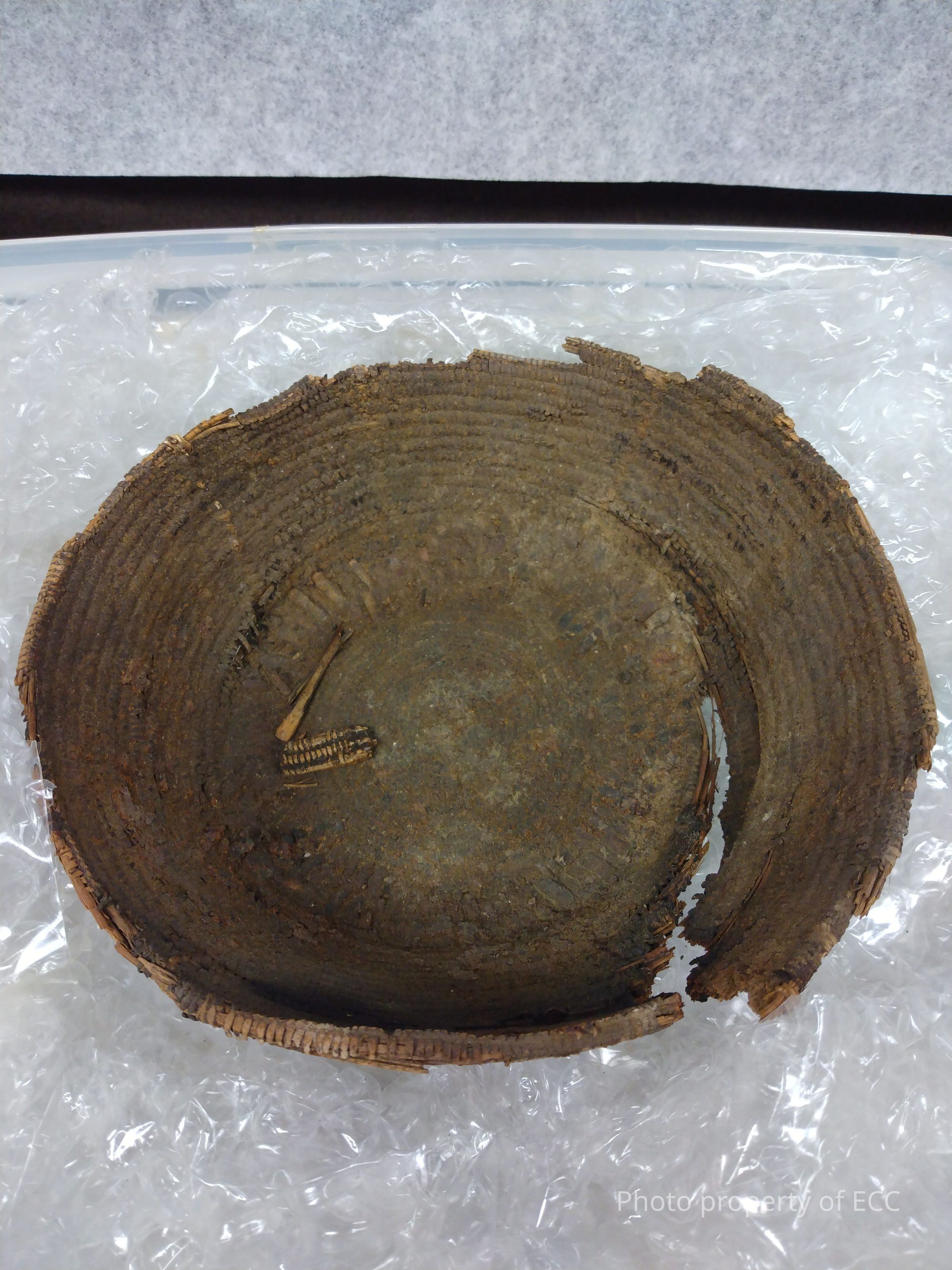 Coiled basket, partially fragmented, with large tear in the side, rim is broken in various places all around. Has dark substance near the area of tear. Has fragments inside of basket. A layer of dirt and dust covers it. Whole thing is very degraded and in poor condition.Collection