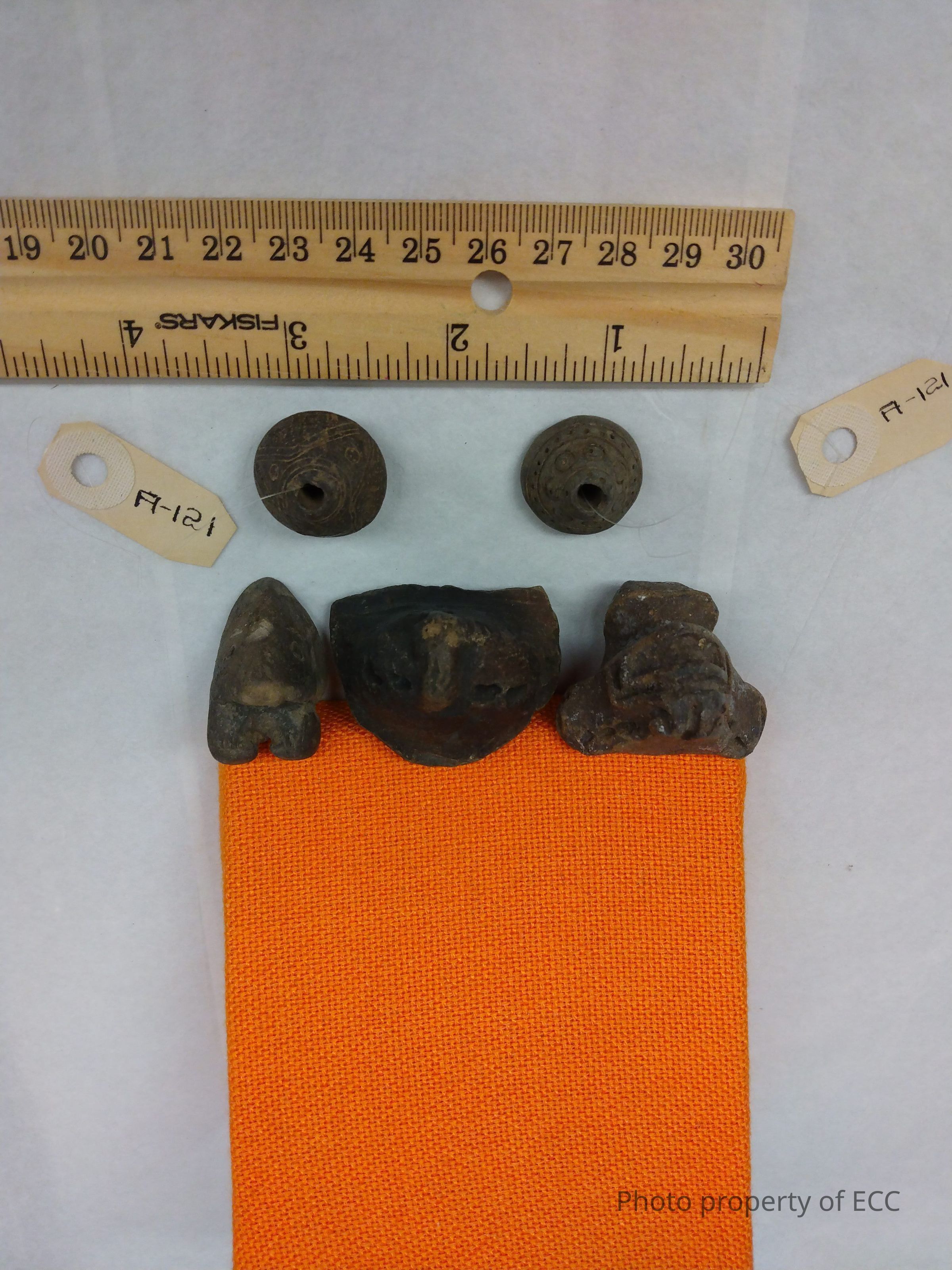 B: Rounded face with long nose and four eye holes and four holes on the side that might be ears. Blunt around back of the head. Might have been broken off from the bottom. Cream/white colored scuff along the bottom of the nose.