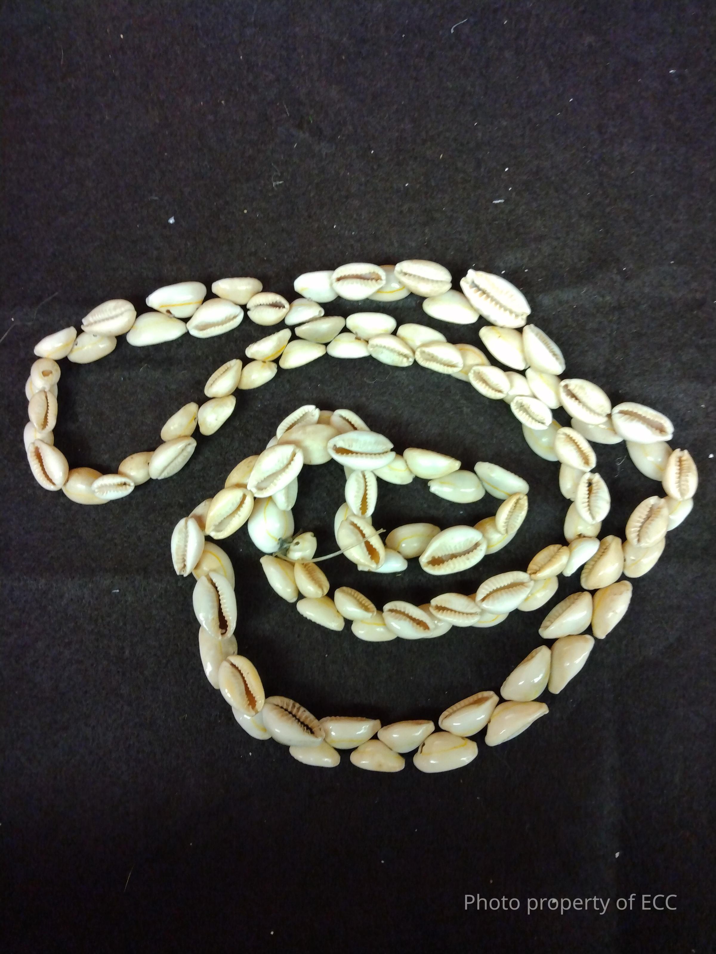 Shells worn and yellowed, with chipped holes were it it strung together. Handle with care.
