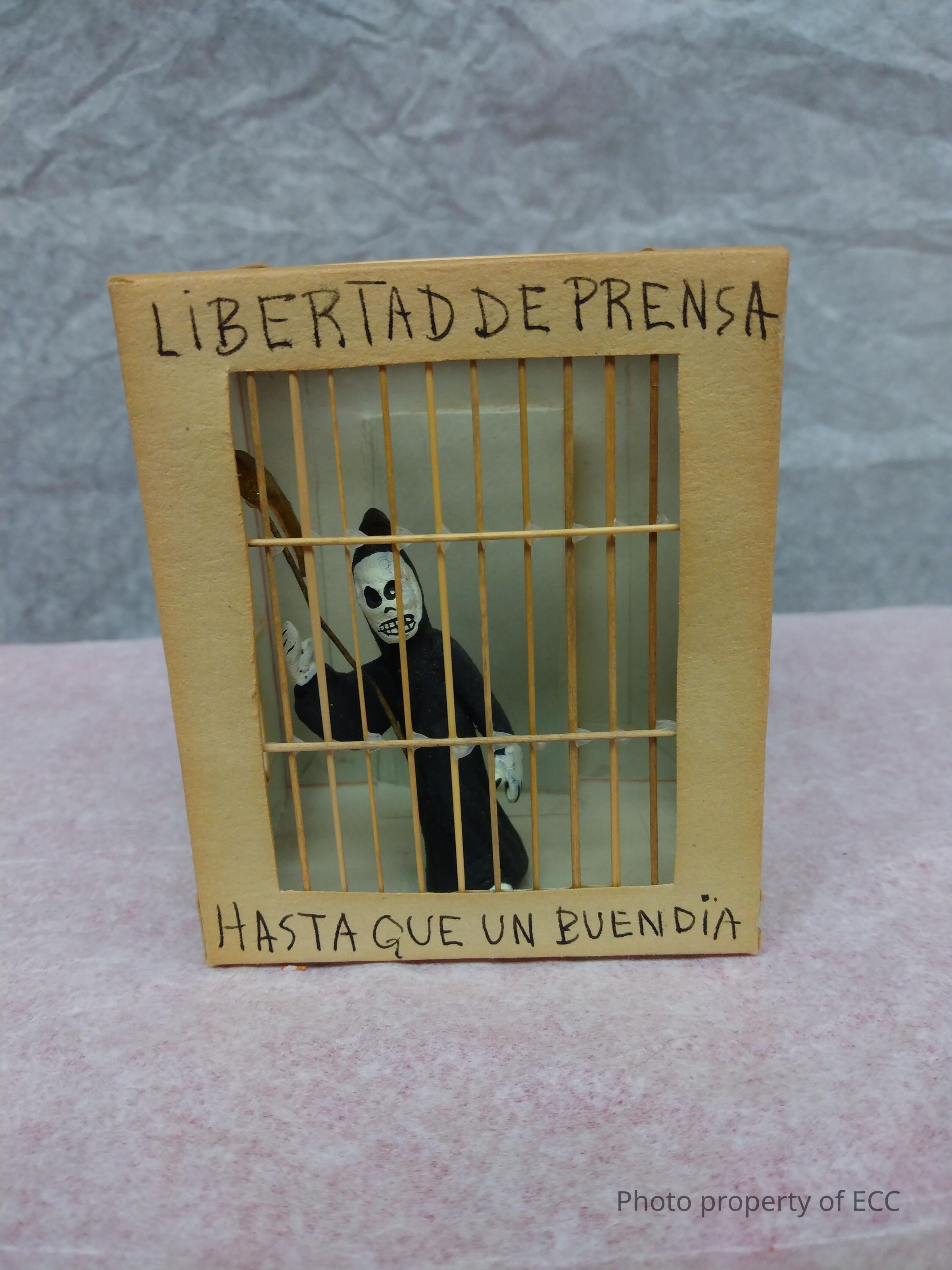 Made out of paper and clay, along with toothpicks for the cell bars, this miniature grim reaper skeleton stands in a jail cell. He wears a black cloak and holds a scythe. The words, "Libertad de Prensa" are written at the top of the cell, while the words, "Hasta que un Buendia," are written on the top.Collection