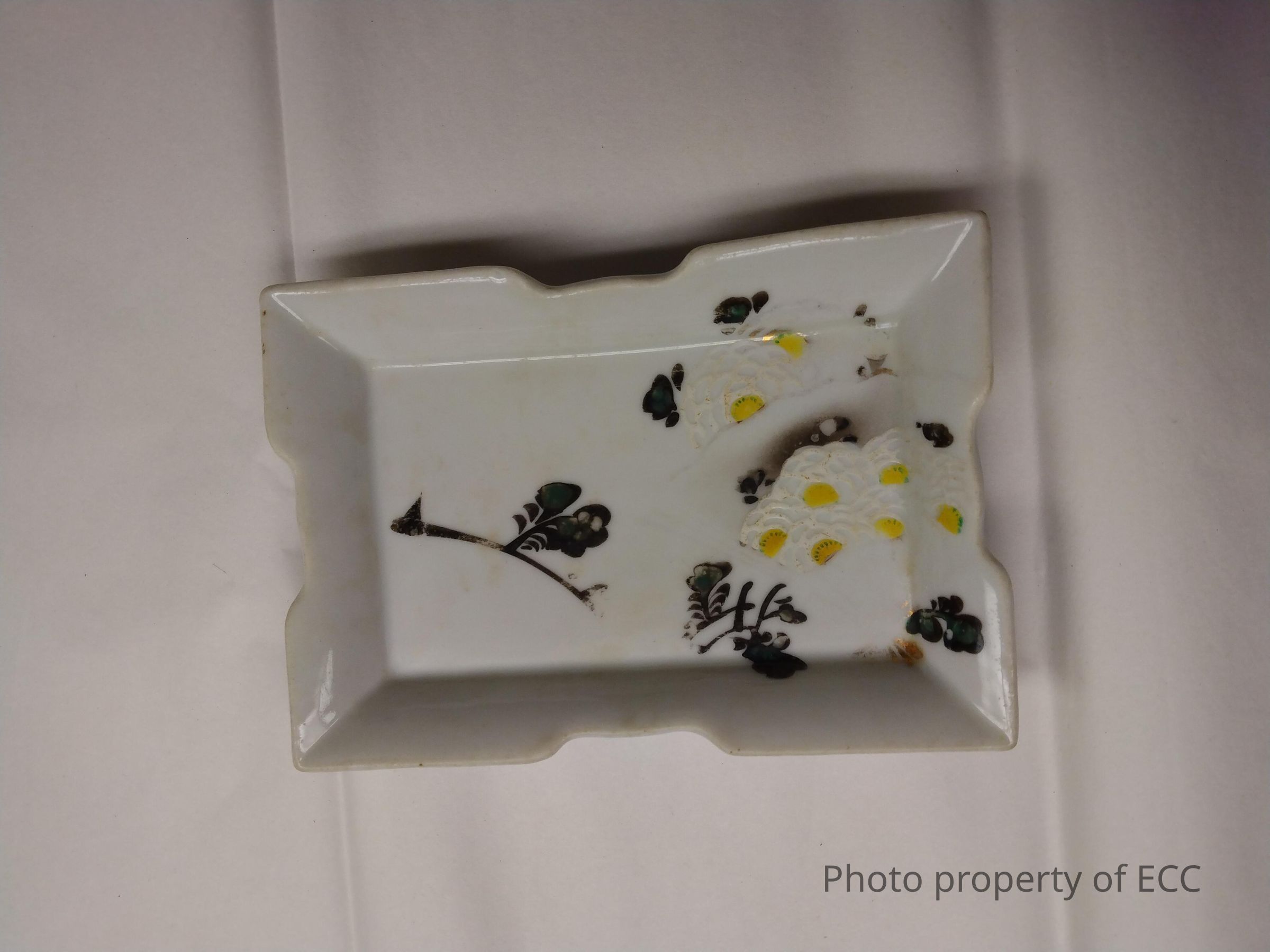 A white food tray with flower design. The flowers are white with yellow centers, black leaves and branches. The tray has notches at each end and the outside of the try contains blue designs.Collection