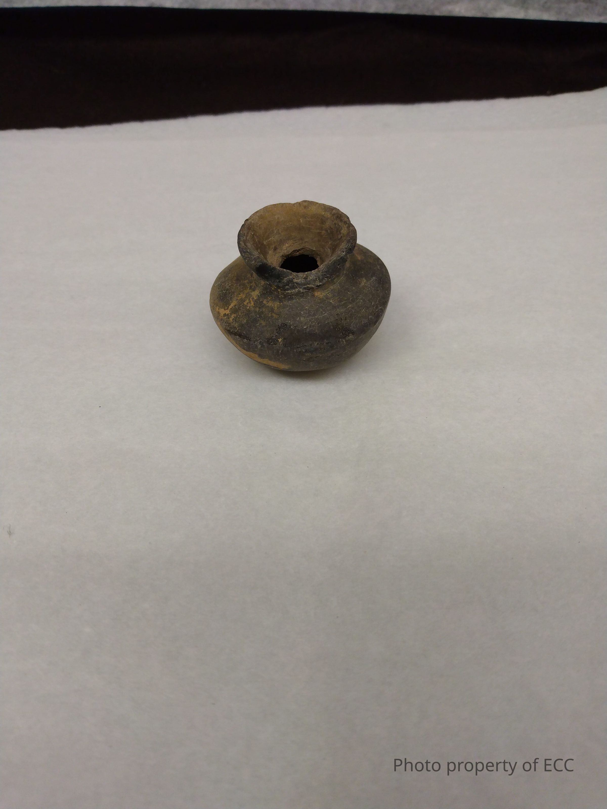 A shaman's blood offering vessel. Grey and brown olla with raised neck and wide lip. Lip is chipped in two places, one small chip and one large. Various small scratches and cracks running throughout. Excellent condition.Use