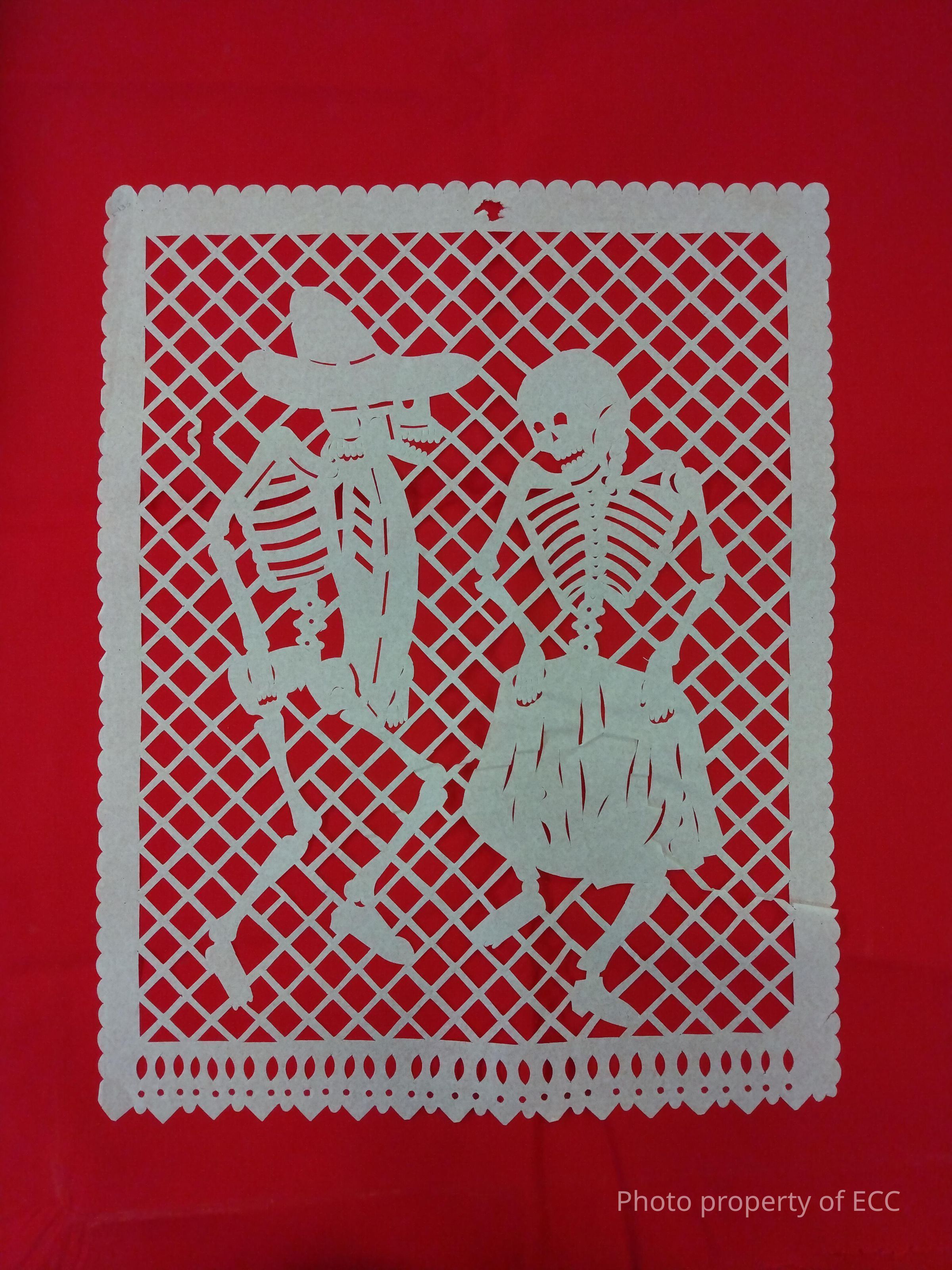 A white sheet of papel picado of a skeleton man and woman dancing.Collection