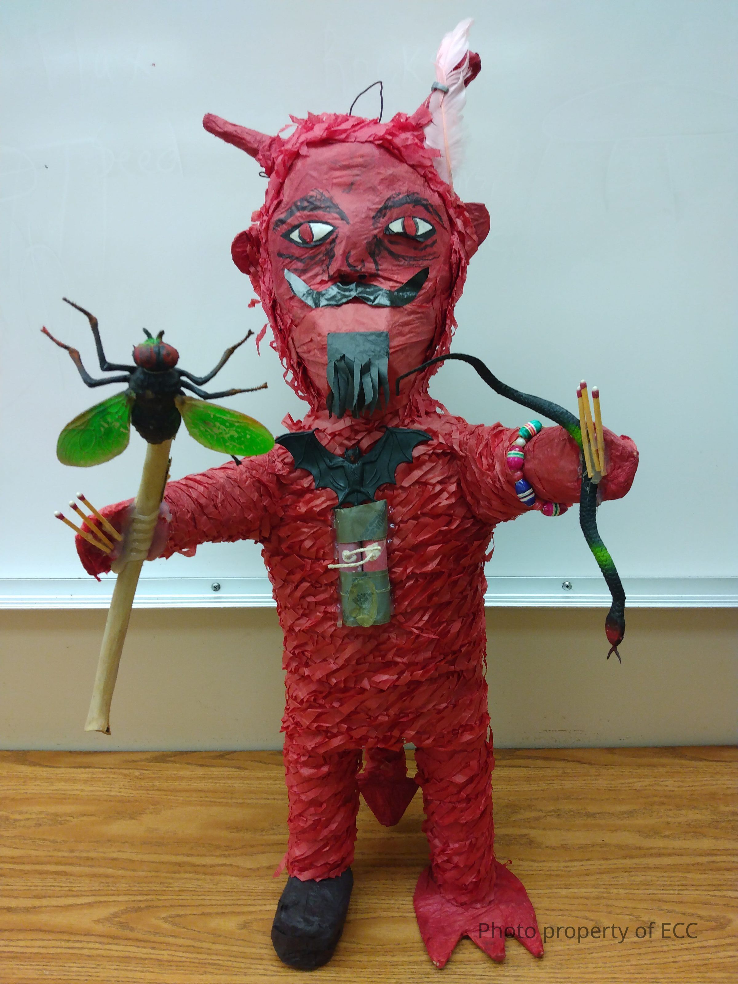 Made of paper-mâché and a few plastic toys, this devil-like figure has a pointed tail, one claw-like foot, and one shoe. Figure is colored red; his face is painted on with a mustache and goatee and two horns. The left horn is decorated with a pink flower held in place with a plastic skull ring. On his right wrist he wears a bracelet with colorful beads, in his hand he holds a rubber snack toy and 3 matches. In his left hand he holds a stick with a rubber fly and a rubber but. On the back of his head is a wire, perhaps used to hang him for display.Use