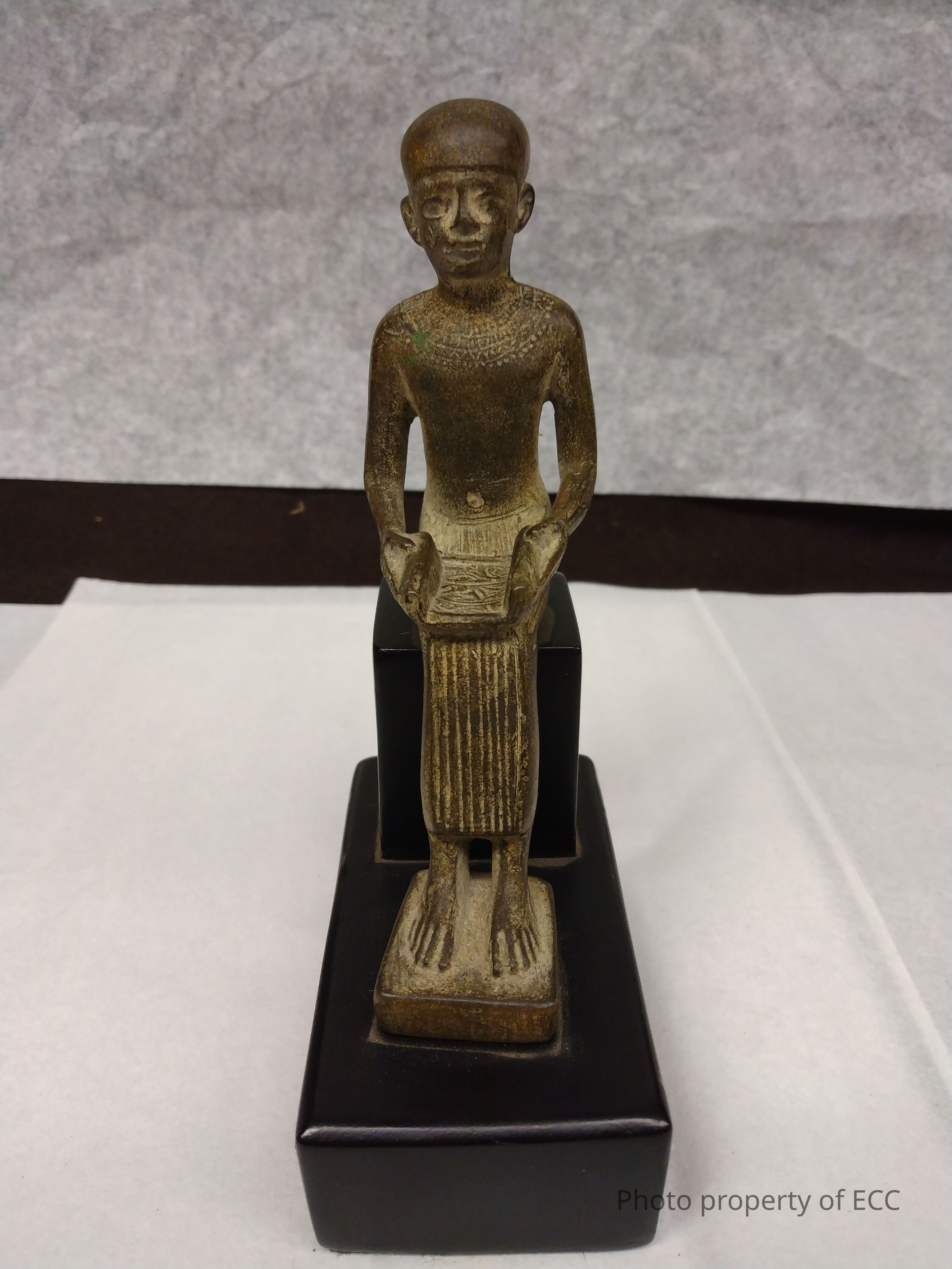 A statue of an Egyptian scribe holding an open papyrus scroll in their hands. The scribe is made out of a brownish stone material and sits on a black stone or ceramic pedestal. The statue is an authentic copyright reproduction of the original statue that is at the Museum of Fine Arts in Boston, Massachusetts.Collection