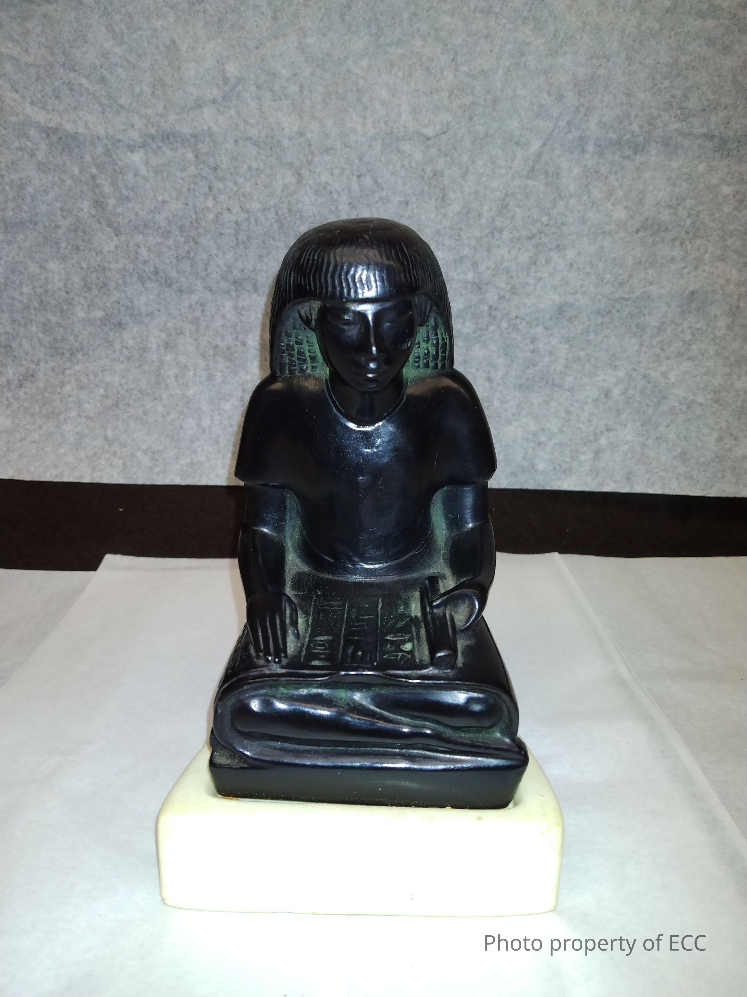 A seated scribe with a papyrus scroll in their lap. The scribe is made out of some unknown material, possibly stone, and is on a cream-colored pedestal. This figure is a reproduction of a statue at the Louvre Museum in France. It was reproduced by Alva Museum Replica in collaboration with the Special Services department of the French National Museums.Collection