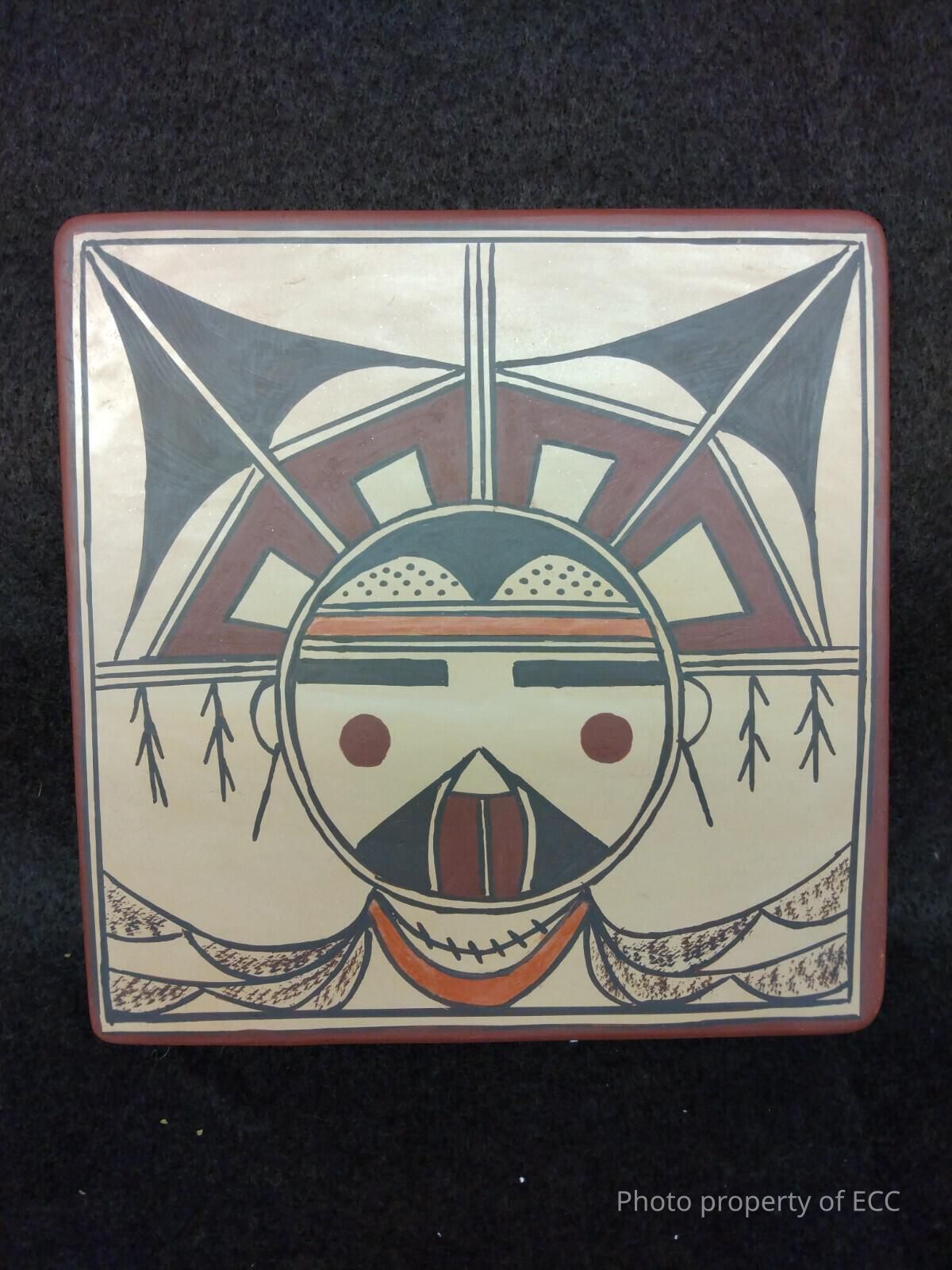 A polychrome painted tile with a kachina face design. It was handmade using native clay and pigments. This tile was made by Jean Shamie Nampeyo in 2003. The back has symbols written in it.Collection