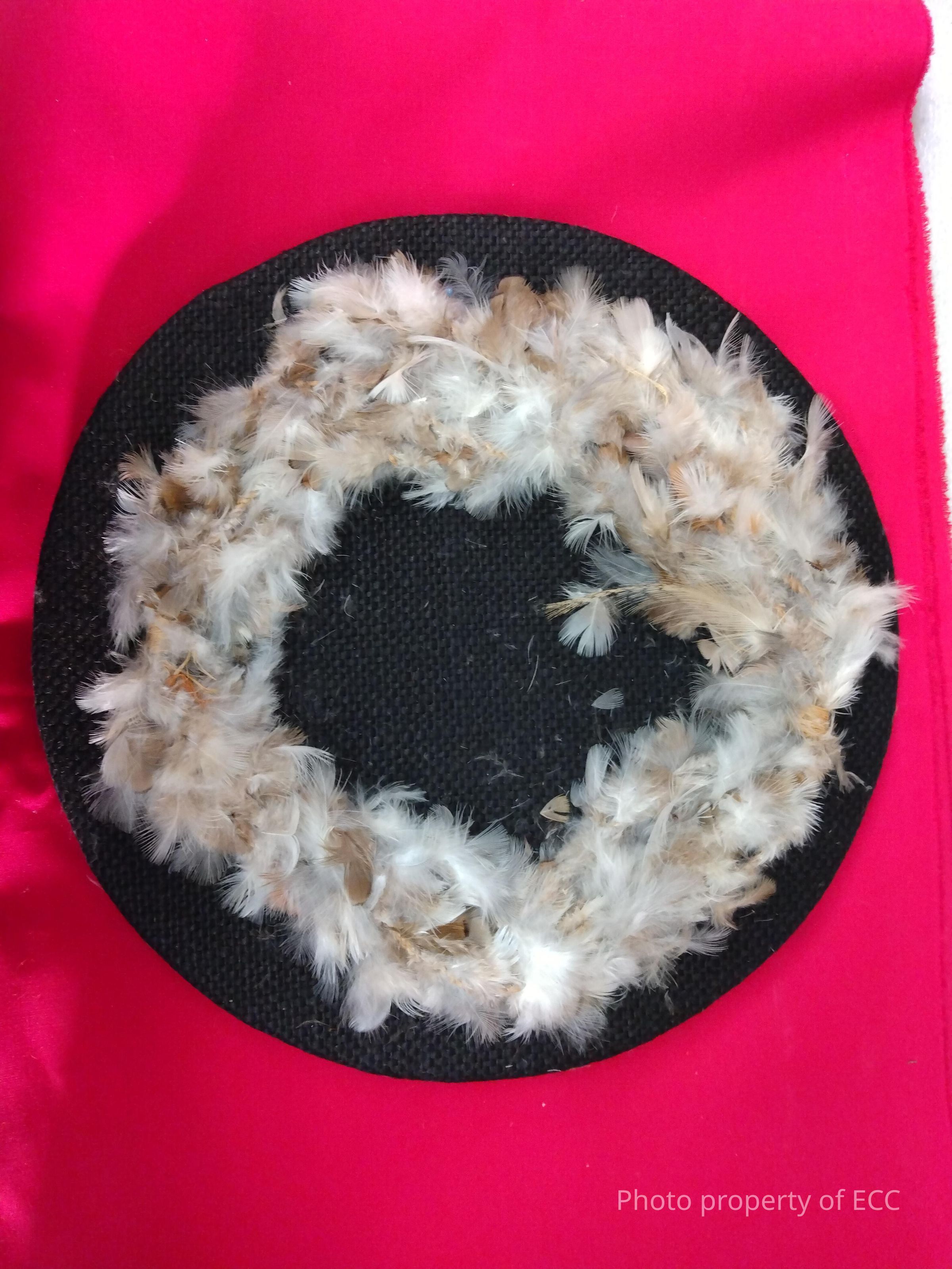 A headdress made of a circlet of feathers, possibly emu. Has various pins holding it in place on the display board.Collection