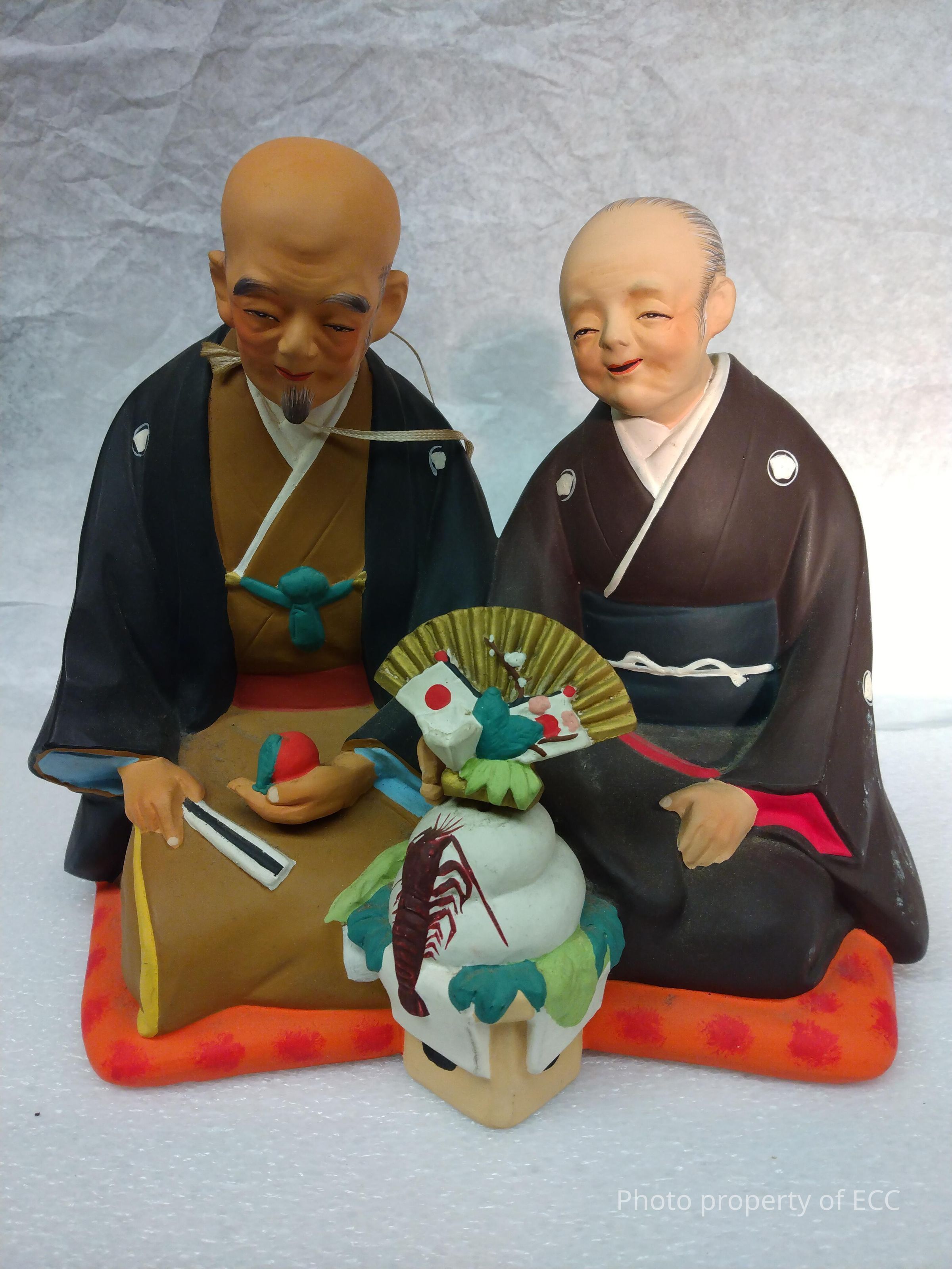 A ceramic hakata urasaki doll (called Hakata Ningyo in Japanese) of an old man and woman sitting on an orange-red base. They are wearing ceremonial clothing of black robes, that have white crests near the shoulders and on the back. The man has light brown clothing on under his black robe and is holding a folded-up fan and an apple in his hands. They are looking at a rice cake that has a lobster on the side and a golden fan on top, as well as a Japanese flag and decorated with cherry blossoms. At the base of the rice cake and the top is some greenery.Context