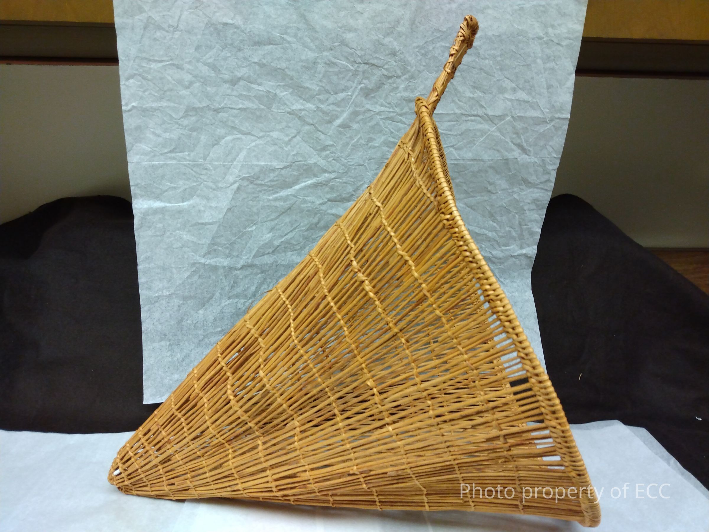 This object seems to be some sort of fish trap made from a sort of tan colored sticks; The trap is cone shaped. with a wide entrance and a narrow end. Around the perimeter of the entrance there seems to be some kind of rectangular handle.Collection