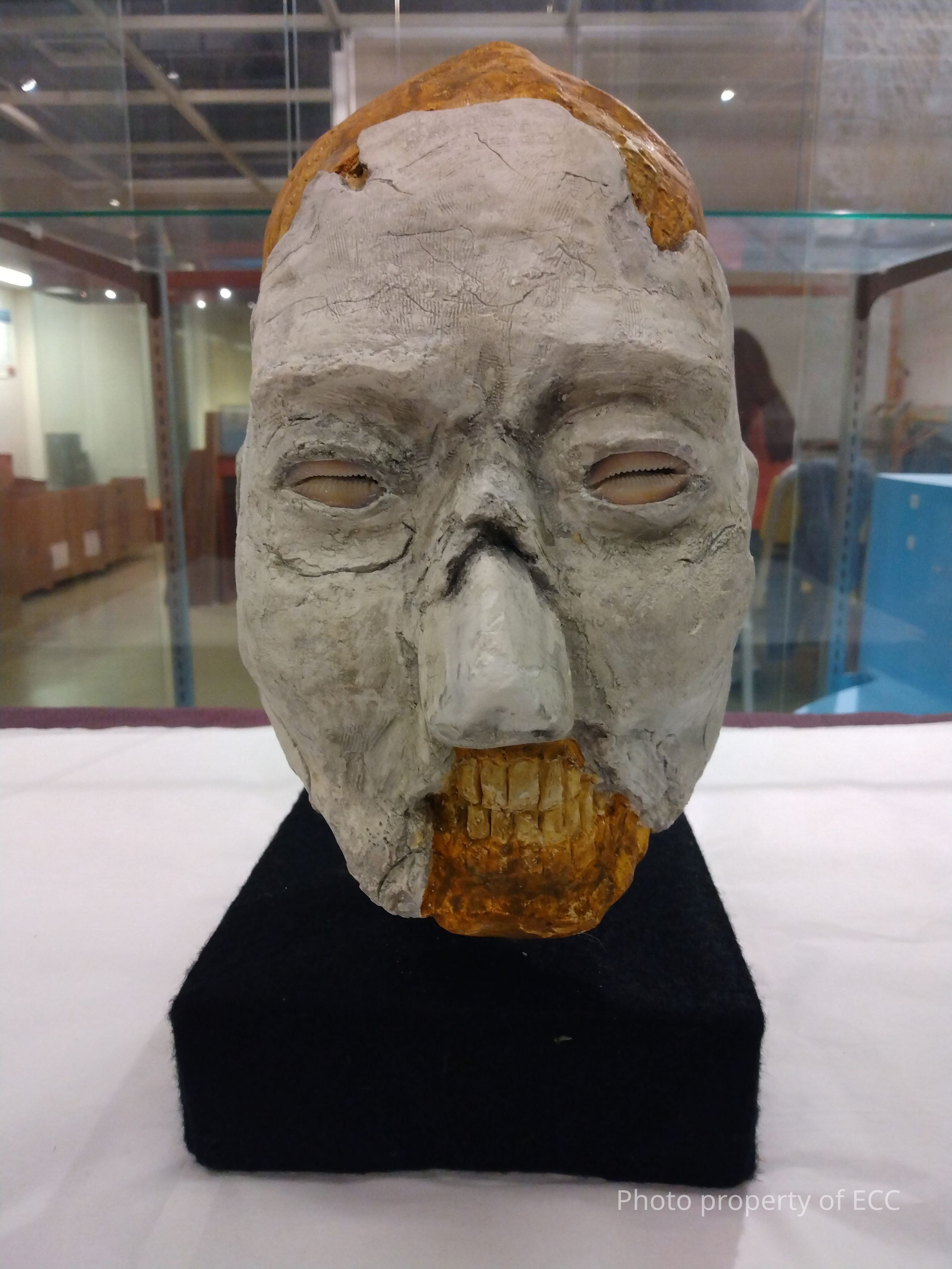 Reproduction of skull covered with clay. Cowrie shell inserts for the eyes. Front of face, sides and back of skull are covered in white plaster. The parts that aren't covered [mouth, teeth, top of skull] are painted dark brown and yellow. There seems to be an intentional gash on the bridge of the nose, there is also a crack in the left eye bag. Much of the scratches on the face seem to be intentional. Skull is on black felt stand, but can be taken off.Collection