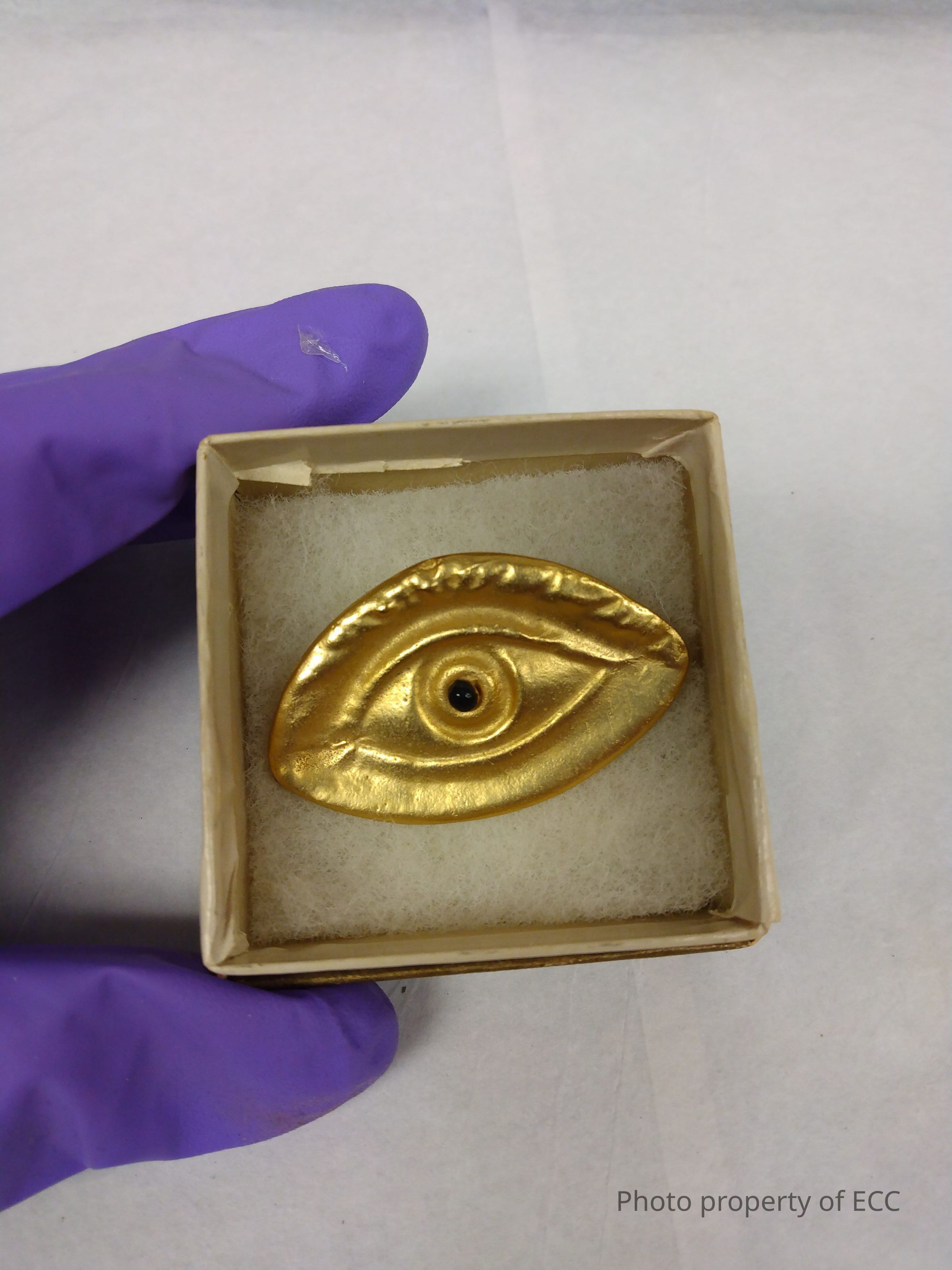 A golden brooch shaped like an eye with a black stone for a pupil. There is a fastening pin on the back. The brooch is most likely from Alva Museum Replicas, New York.Item Type