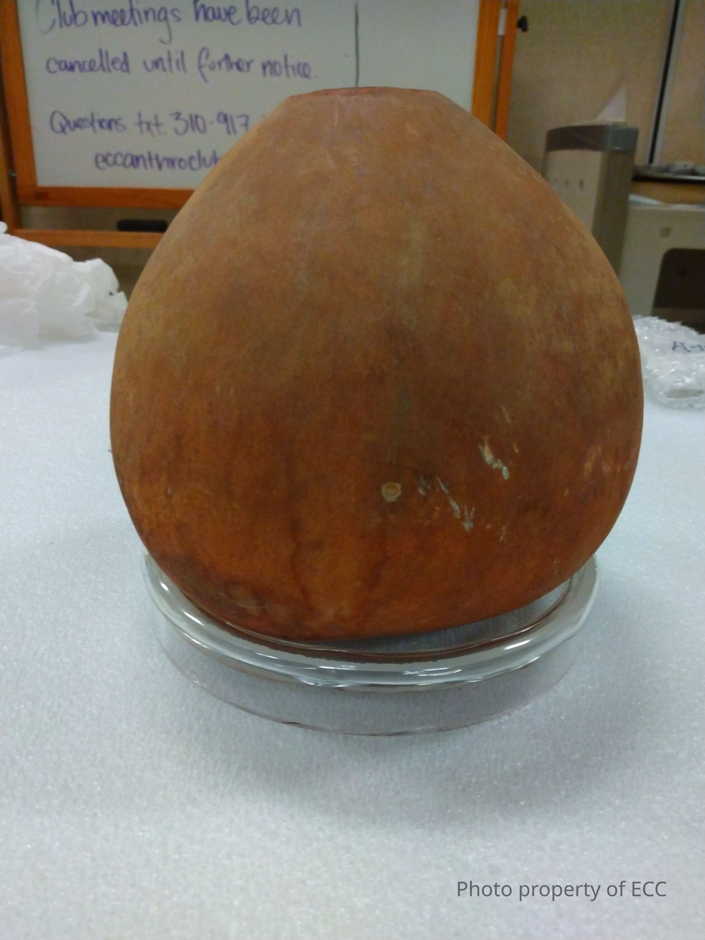 Large, bottle gourd (Lagenaria siceraria or Calabash gourd) that has been made into a container. Top has been cut off to make a 3.7 cm aperture, possibly painted or discolored around the rim. Gourd is a brownish orange in color. Found in a cave along the Colorado River between El Dorado Canyon and Cottonwood Cove with A-140-144 and A-335.Collection
