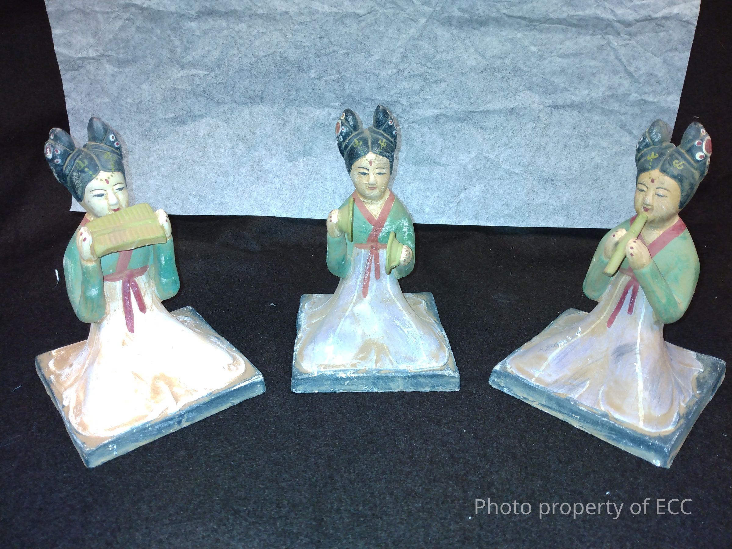 Made of ceramic, these three musicians are dressed in traditional Chinese women's clothing, called Ruqun, consisting of a blouse and wrap around skirt, with the blouse tucked into the skirt. With their hair up in two buns, each girl also wears decorative jewelry painted into their hair, and on their foreheads. Each girl is playing an individual instrument: Girl A is playing a single flute, Girl B is playing two cymbals, while Girl C plays a pan flute. On the bottom of these three statues is a price tag from Cost Plus, as they were purchased as extra objects for a past exhibit.Collection