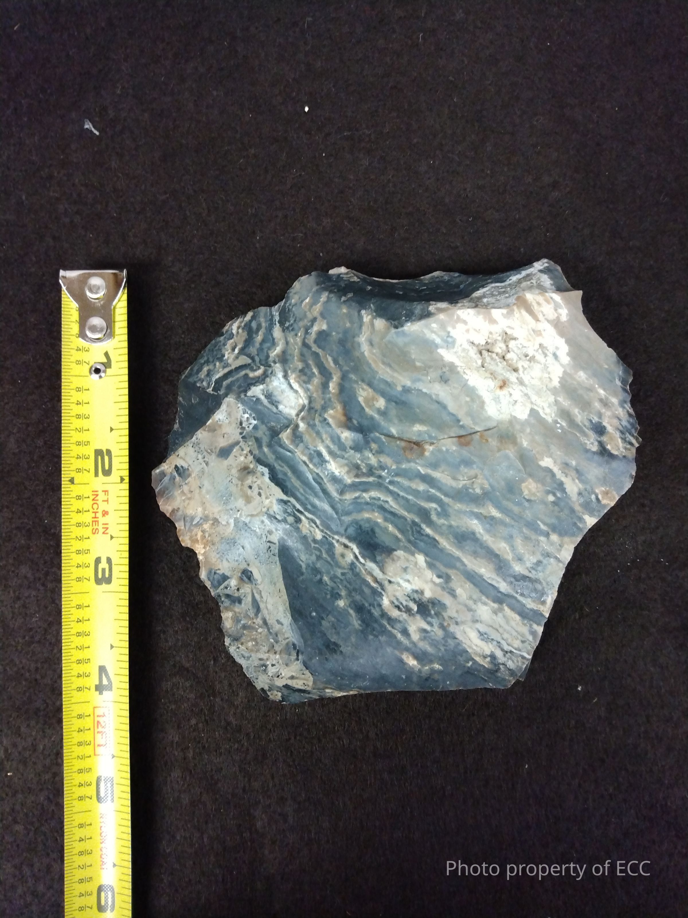 A hand axe made of chert, used for chopping or cutting. Has tape on one side, as well as a spot of white out.Collection