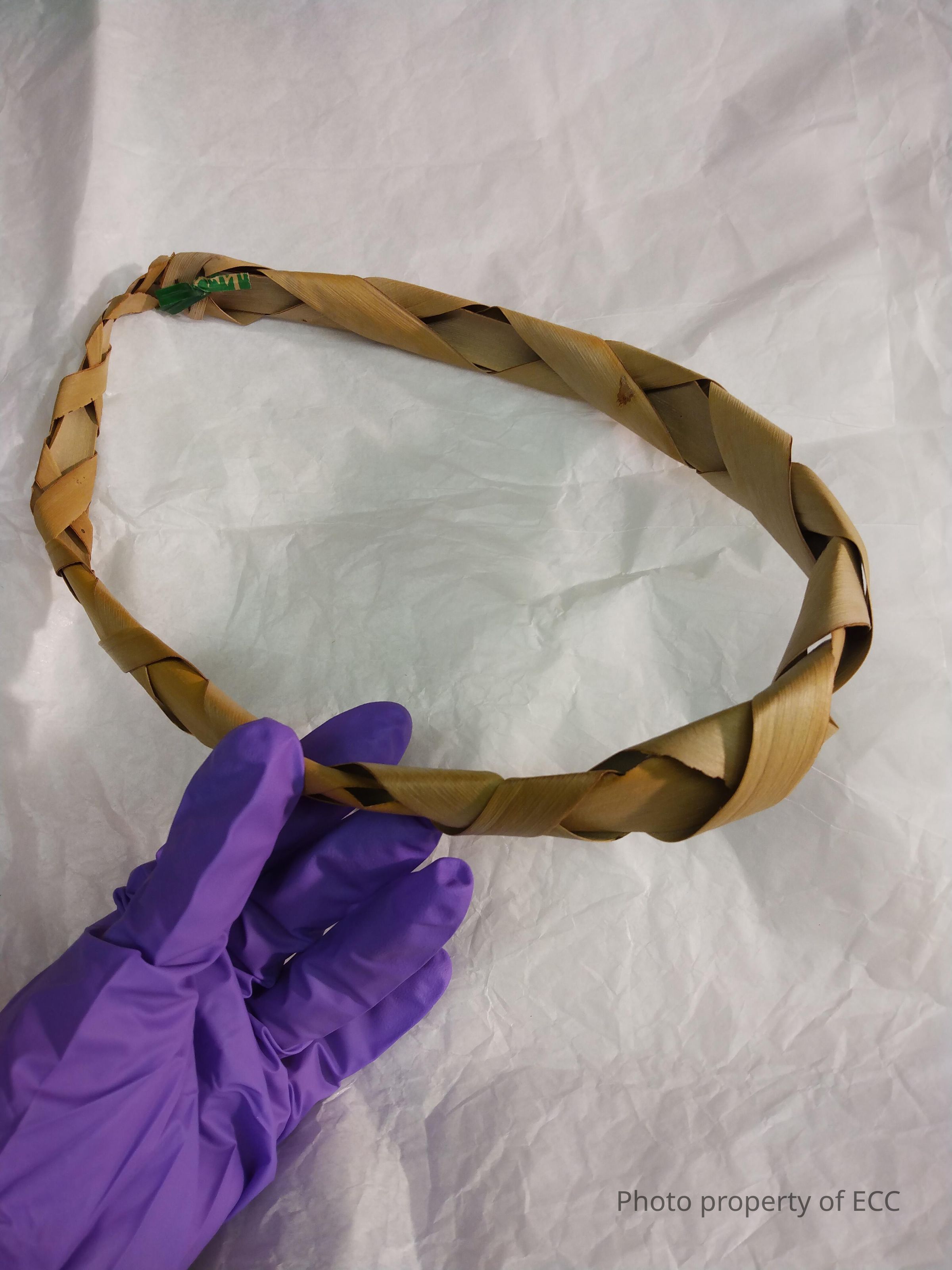 Braided headband made from palm leaves attached with twist tie and staple.