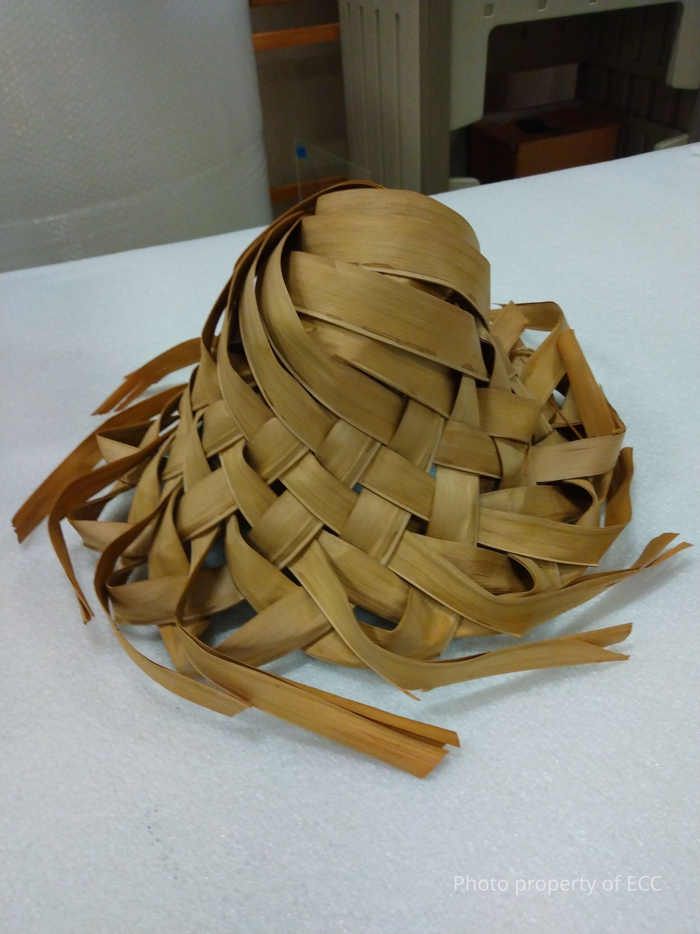Conical shaped headpiece made from palm leaves. Palm fronds and cording attachments. Cord attached to outside leaf.Collection