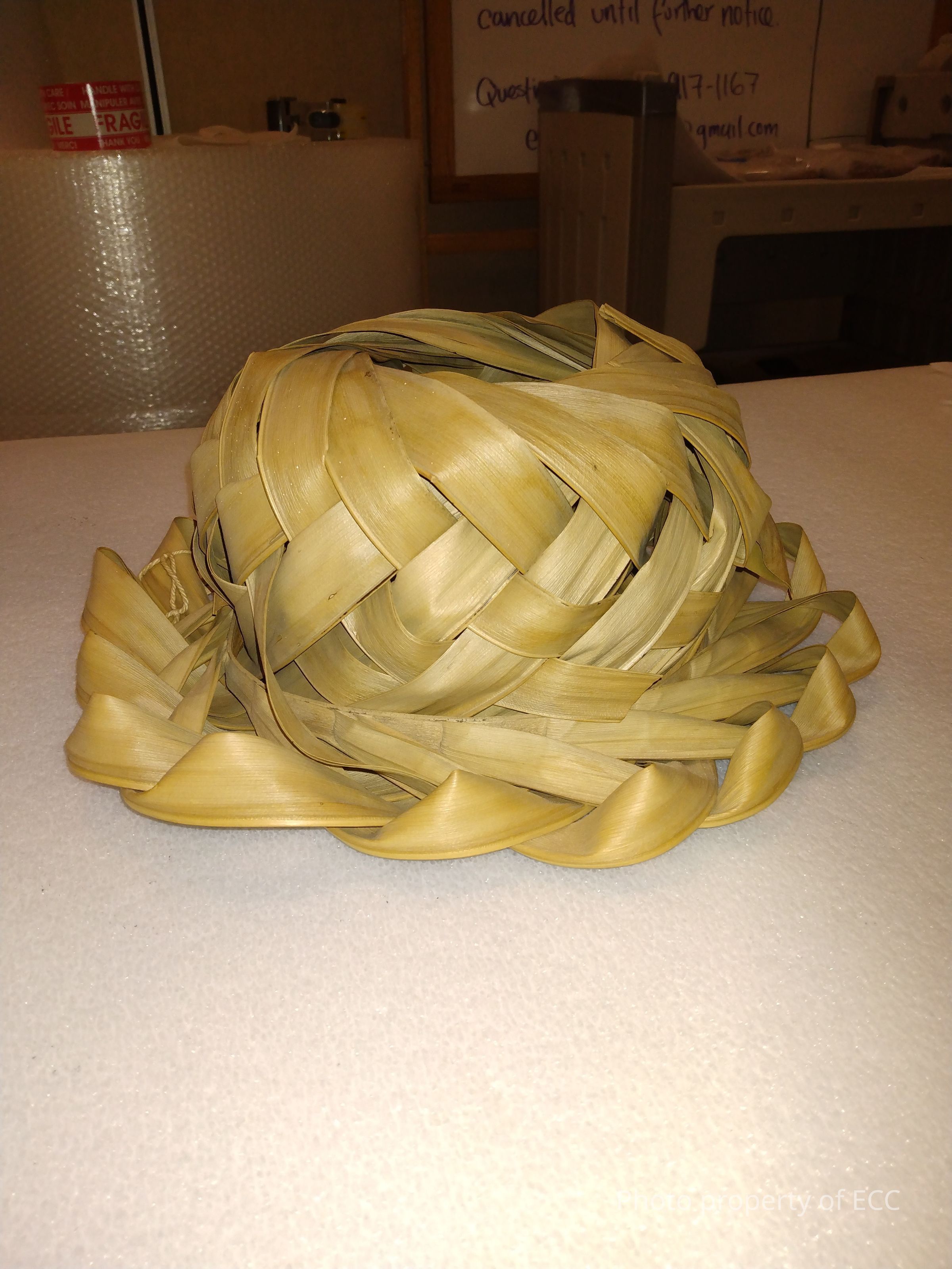 Headpiece made from braided palm leaves with cording. Cord also hangs from brim. Headpiece with opening on top and has brim.Collection
