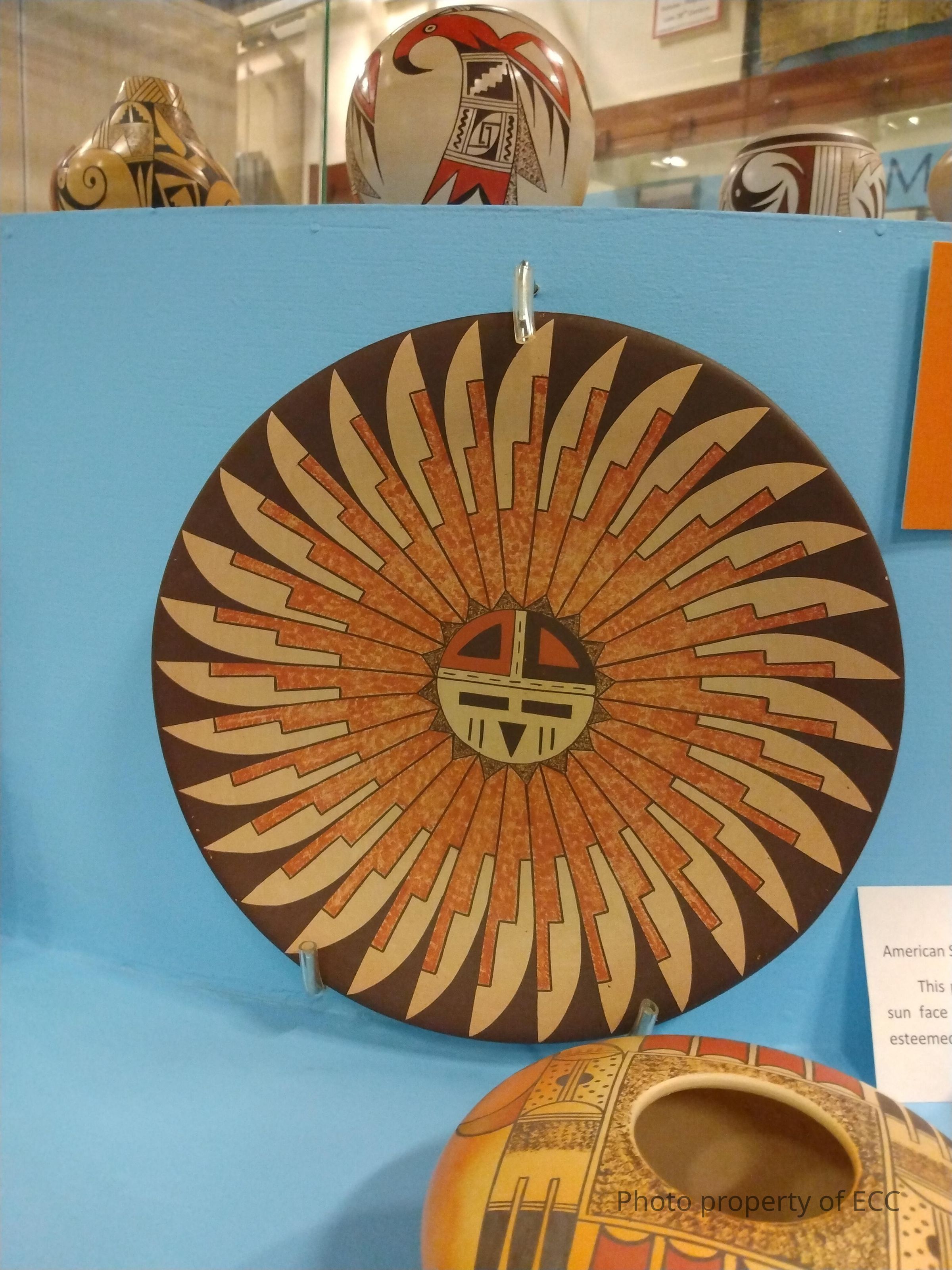 Hand made plate made from native clay. It has a painted sun face design with red and black coloring on buff polychrome. It was made by Val KaheCollection