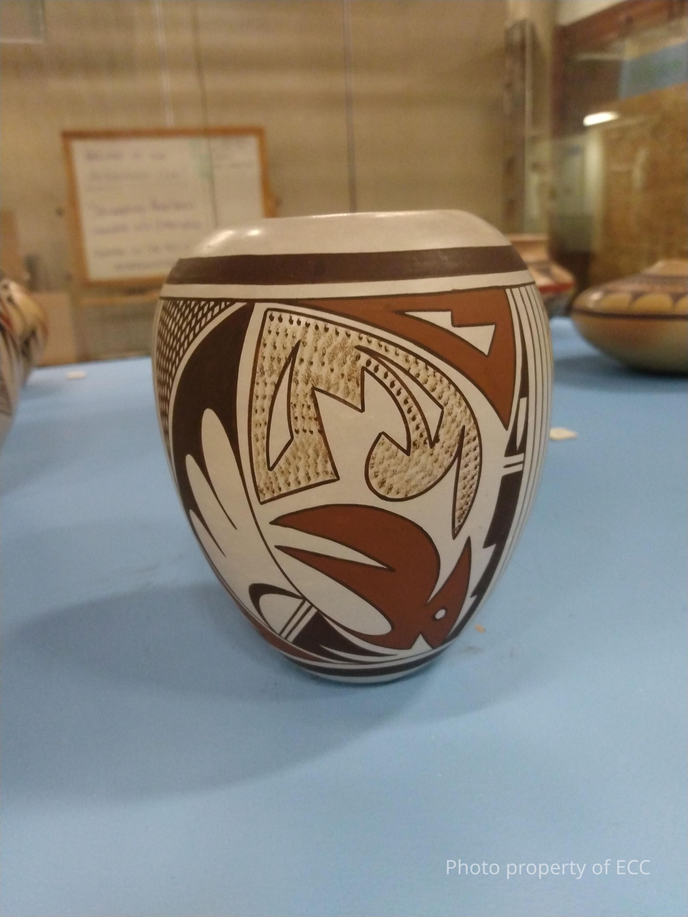 A jar painted with a stylized bird design. It is decorated with black and red paint on white polychrome. The jar is handmade using coil and scraping method with native clay. The bottom of the jar is signed "M.N. & V.N.," standing for Maynard and Veronica Navasie and an icon of a frog. The bottom of the jar also has "145" written in pencil.Collection