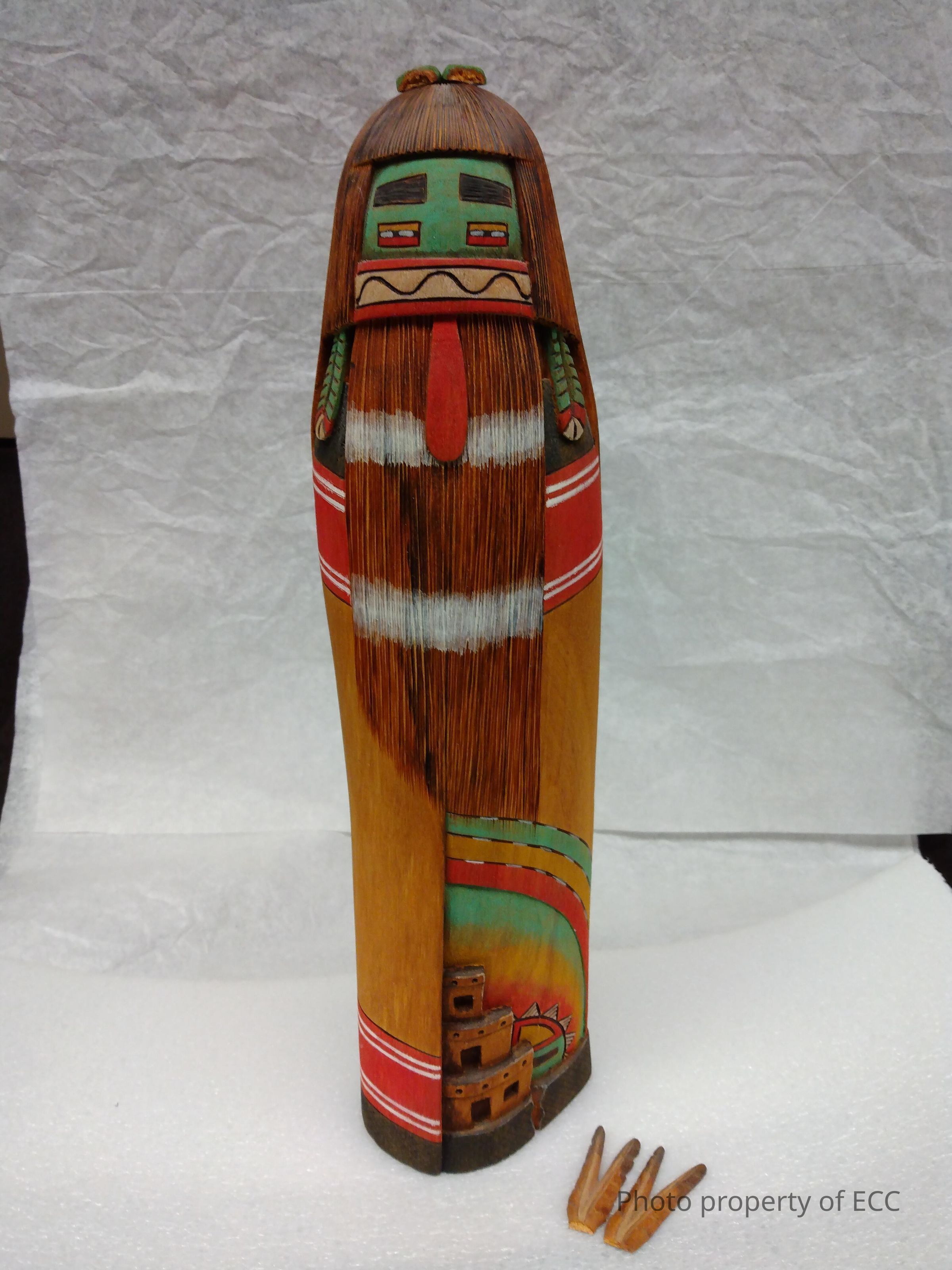 Free of discoloration but the feathers from headpiece are broken. Damaged during an earthquake, the feathers belonging to the headpiece fell off, and are now stored with the object in a marked packet.