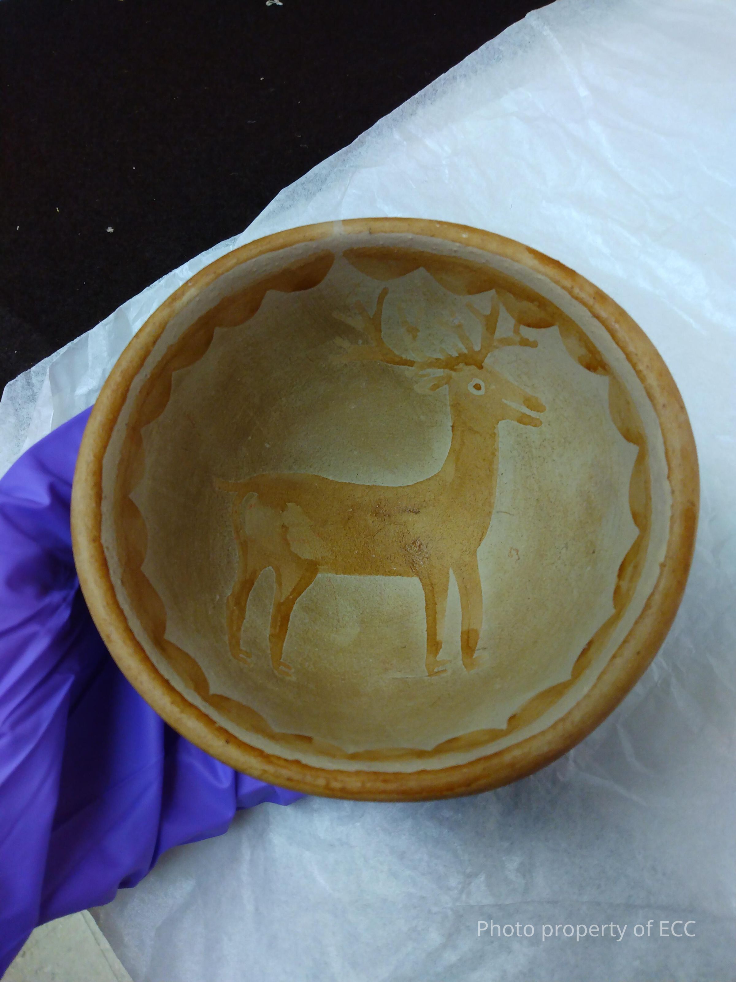 A greenware bowl with artwork of a deer and scalloped design painted inside. Around the outside lip of the bowl has a design of leaves.Collection
