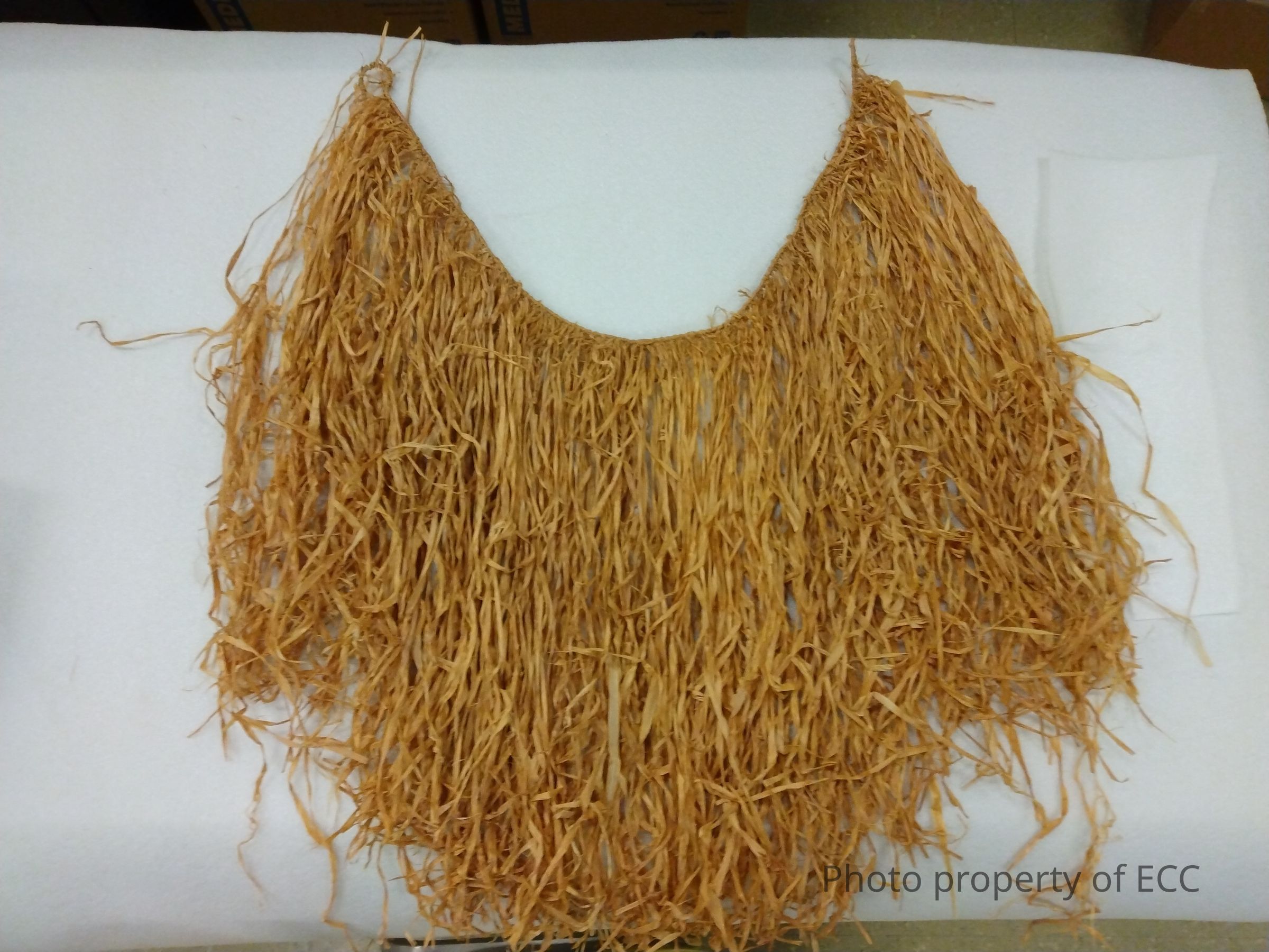 A long grass skirt with a waist string made of the same grass, braded and tied into a cord/tie. The grass is very dry and brittle, more of a straw quality than grass. This particular skirt was probably made as a souvenir for tourists.Use