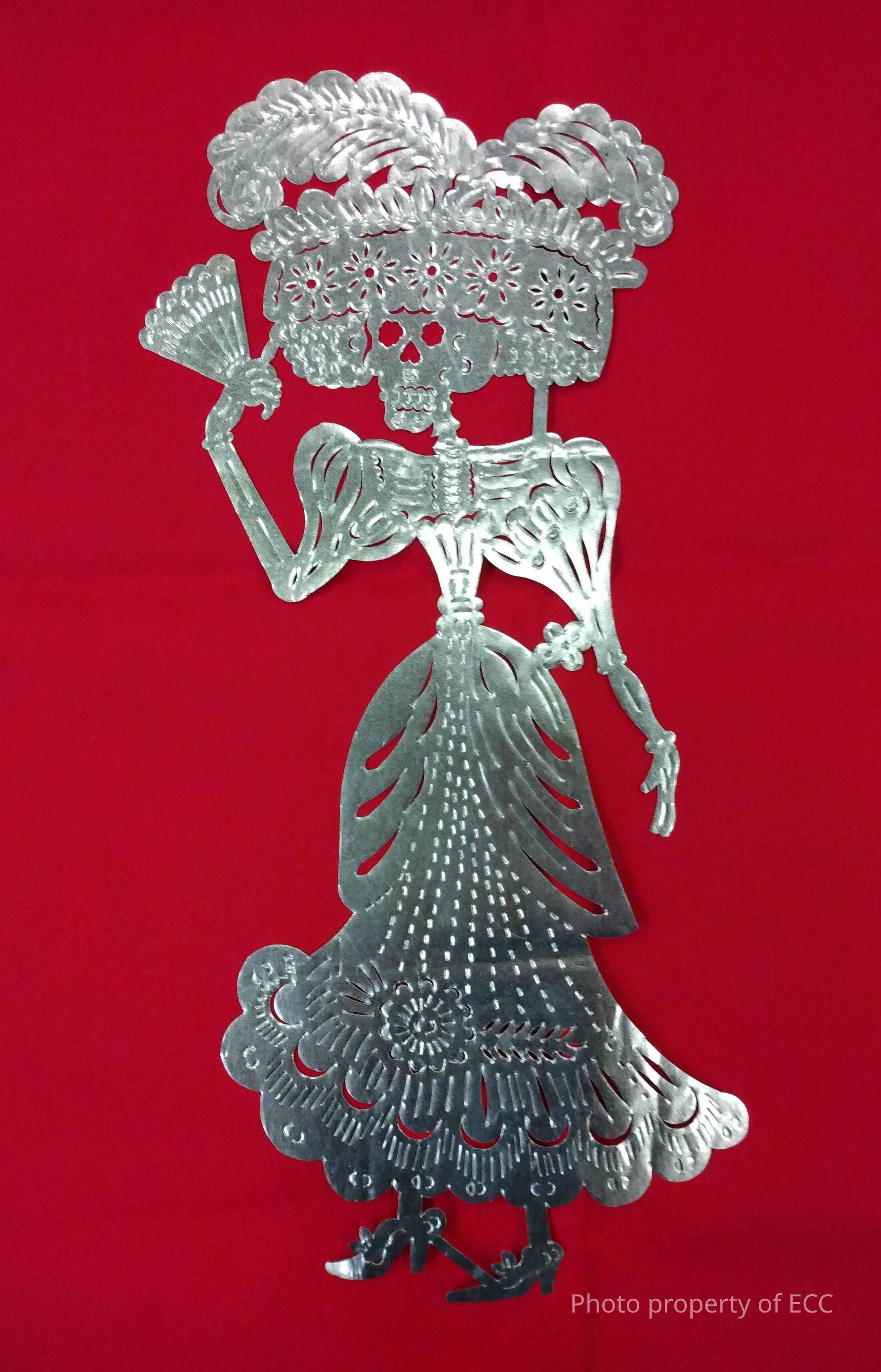 A silver Metallic cutout of La Catrina. This cutout showcases her with a large feathered hat and a fan. It is more reminiscent of Mexican artist, Jose Guadalupe Posada's interpretation of La Catrina.Use