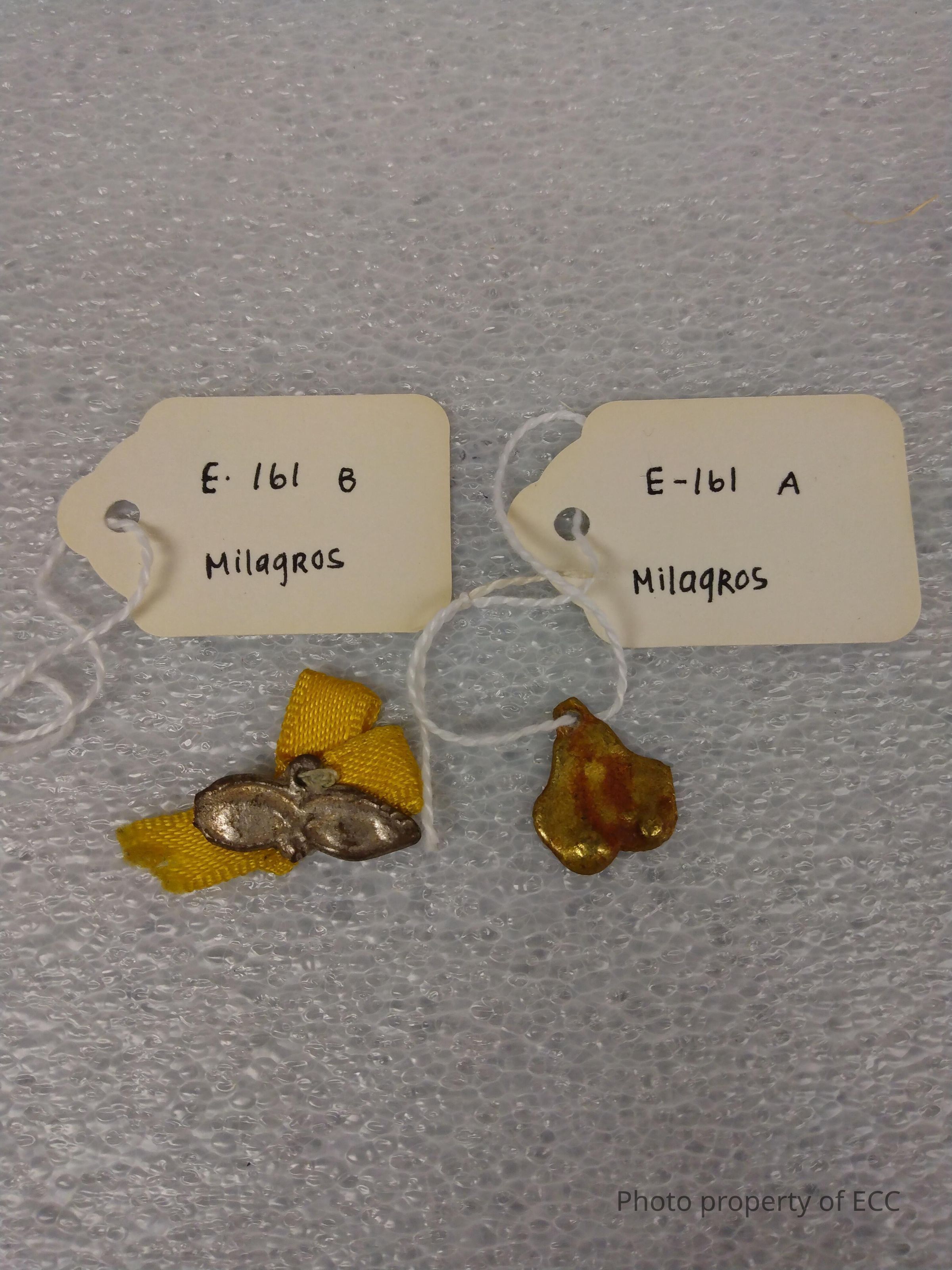 Two small metal charms, one on a piece of yellow ribbon, called milagros. Milagros are carried for good luck and to ward off evil. They can range in size, and can depict almost anything, such as body parts, animals, or religious figures. These two depict a heart and a flying bird. See the article below for more information.Use