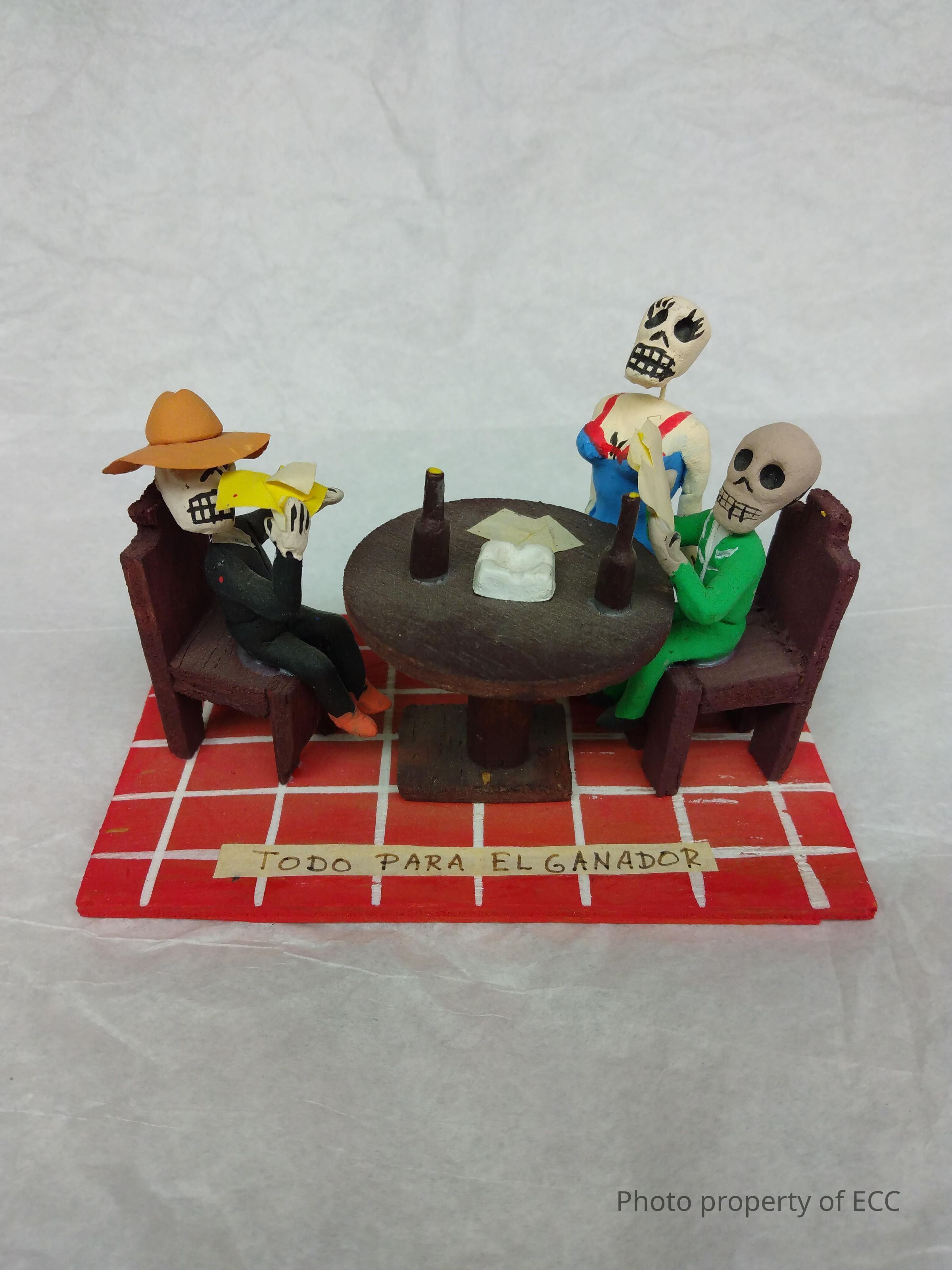 A clay and wood miniature scene of three skeletons, two men and one woman, at a table drinking and playing cards. The floor is red and white, while the two seated skeleton men are wearing black and green suits. The man in black also wears a tan, wide brimmed hat. The woman skeleton is standing, dressed in a long blue dress. All three of them have cards, made of slips of paper. A slip of paper rests on the floor, with the words, "Todo Para El Ganador," in Spanish, which means "Winner takes all" in English.Collection