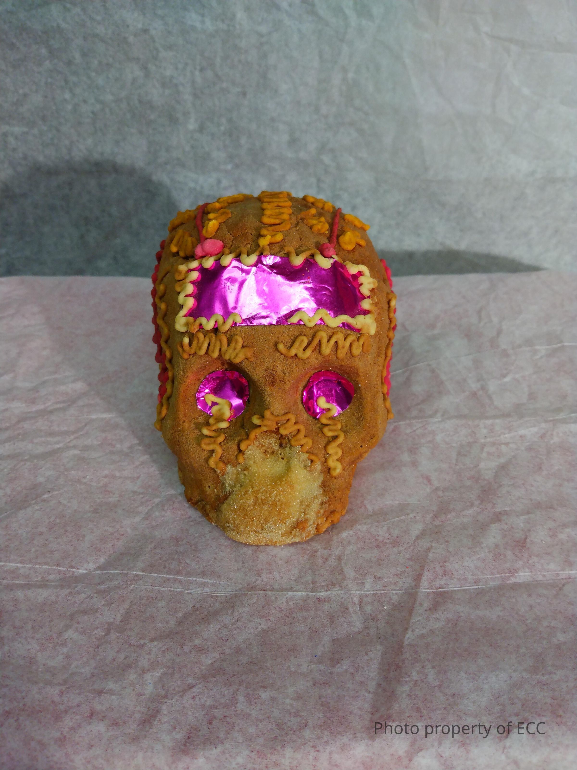Skull with pink eyes and metallic pink paper on forehead. White, yellow, and red markings all over the face and head.Collection