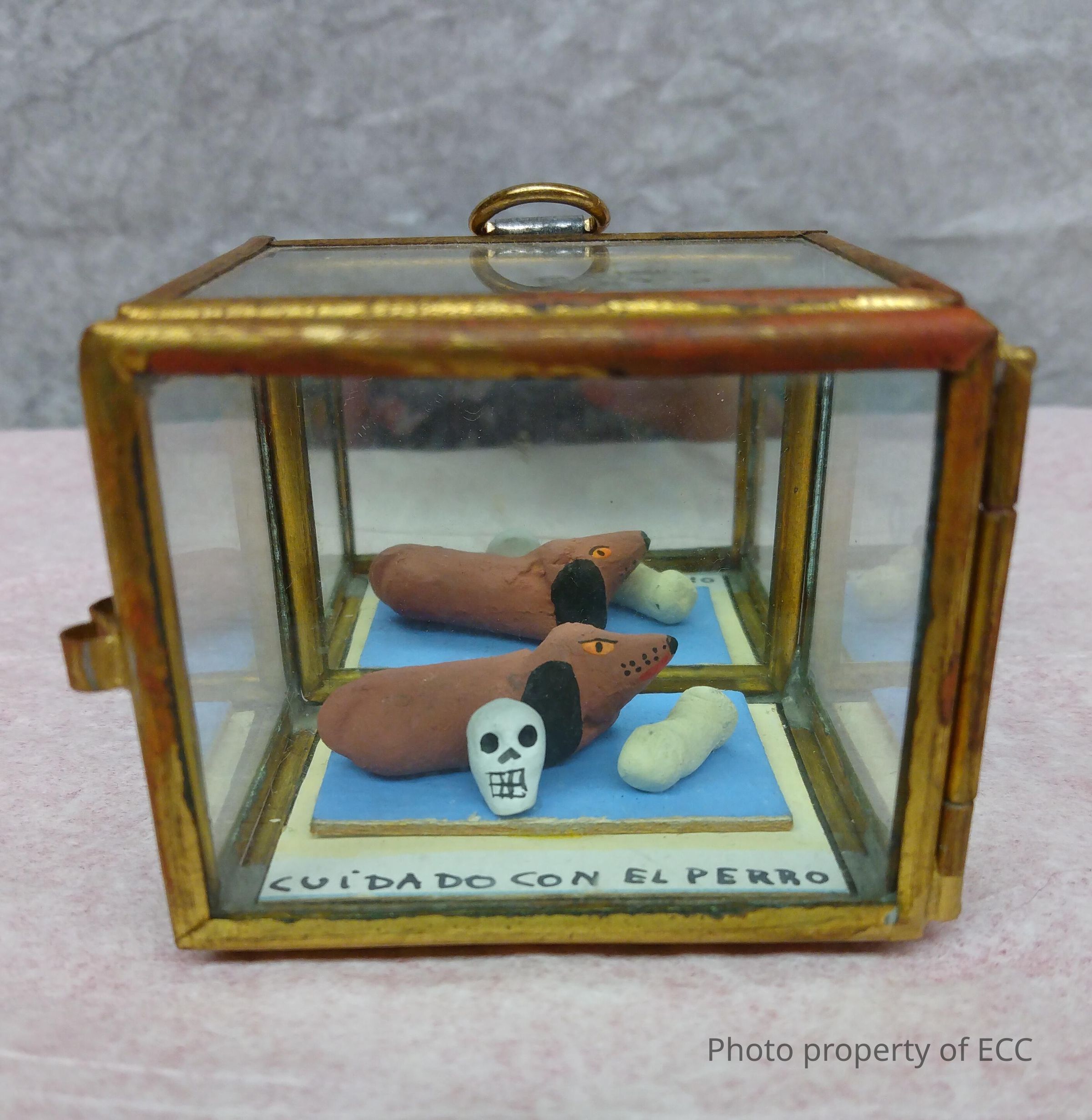 A small brown dog sits in a small glass box, on a blue base, with a skull and bone. The dog has black ears, and his eyes are colored orange, with mean look on his face. The words "Cuidado con el perro" ("Beware of the dog" in English") are written in Spanish. The front of the glass box can be opened.Collection