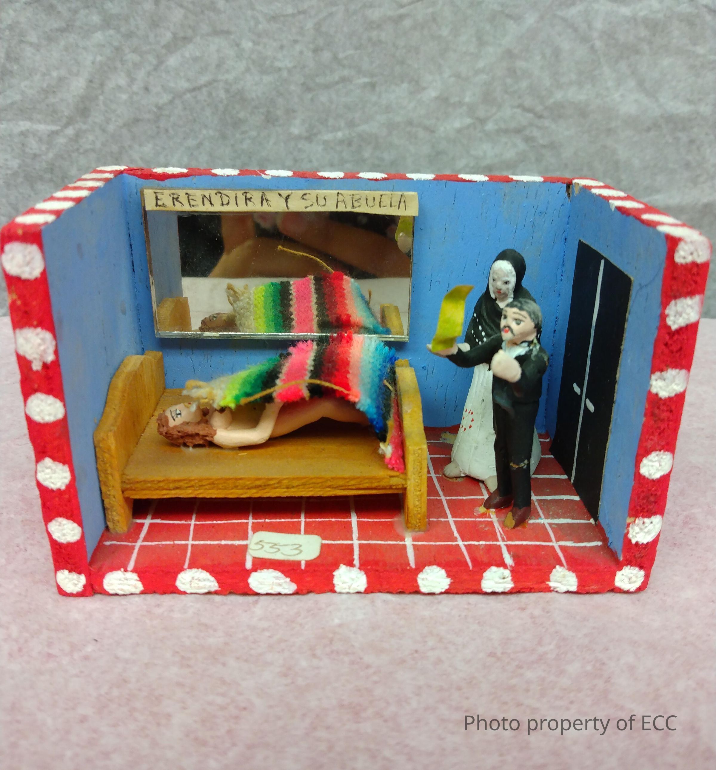 A miniature scene made of wood, clay and a small mirror, shows three people, a man in a black suit, holding a slip of paper, an old woman, and naked young girl in a wooden bed, covered by a colorful blanket. The box the scene takes place in is red, with blue walls, and white dots along the edges, a black door on the right side. There is also slip of paper along the top of a small mirror on the back wall, with the words, "Erendira y su abuela" in Spanish. Perhaps this is a scene of last rites taking place?Collection
