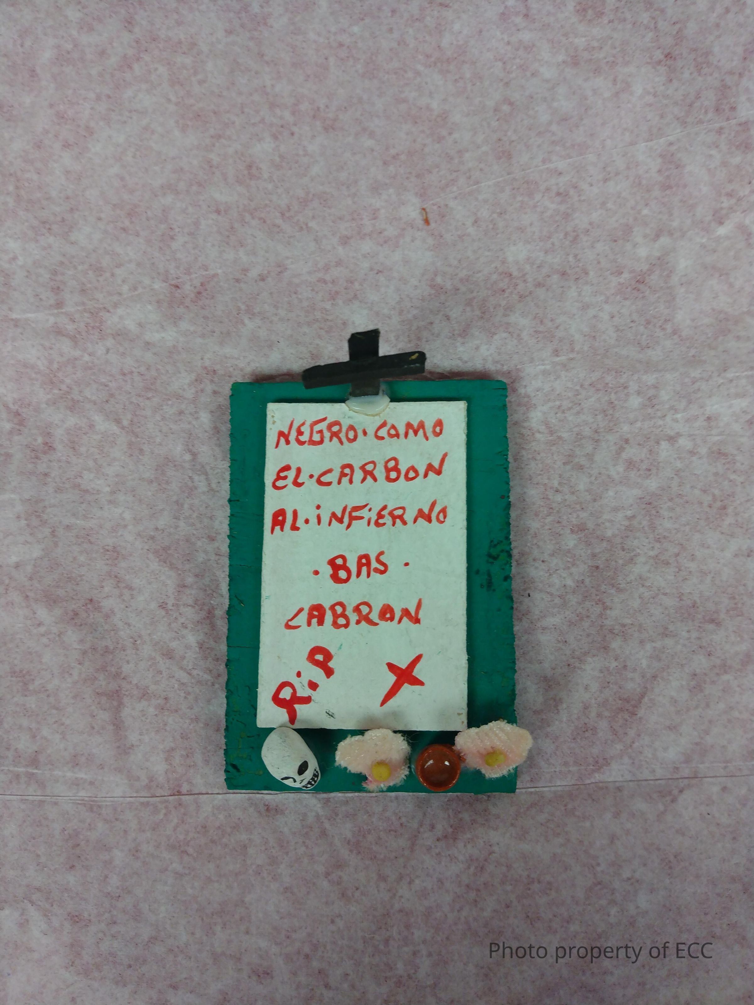 This small grave is white on a green base, with a black cross at the head. A skull, two pink flowers made of cloth, and a small pot lay at the foot of the grave. In red, the epitaph "Negro camo el carbon al infierno bas cabron RIP," is written in Spanish.Collection