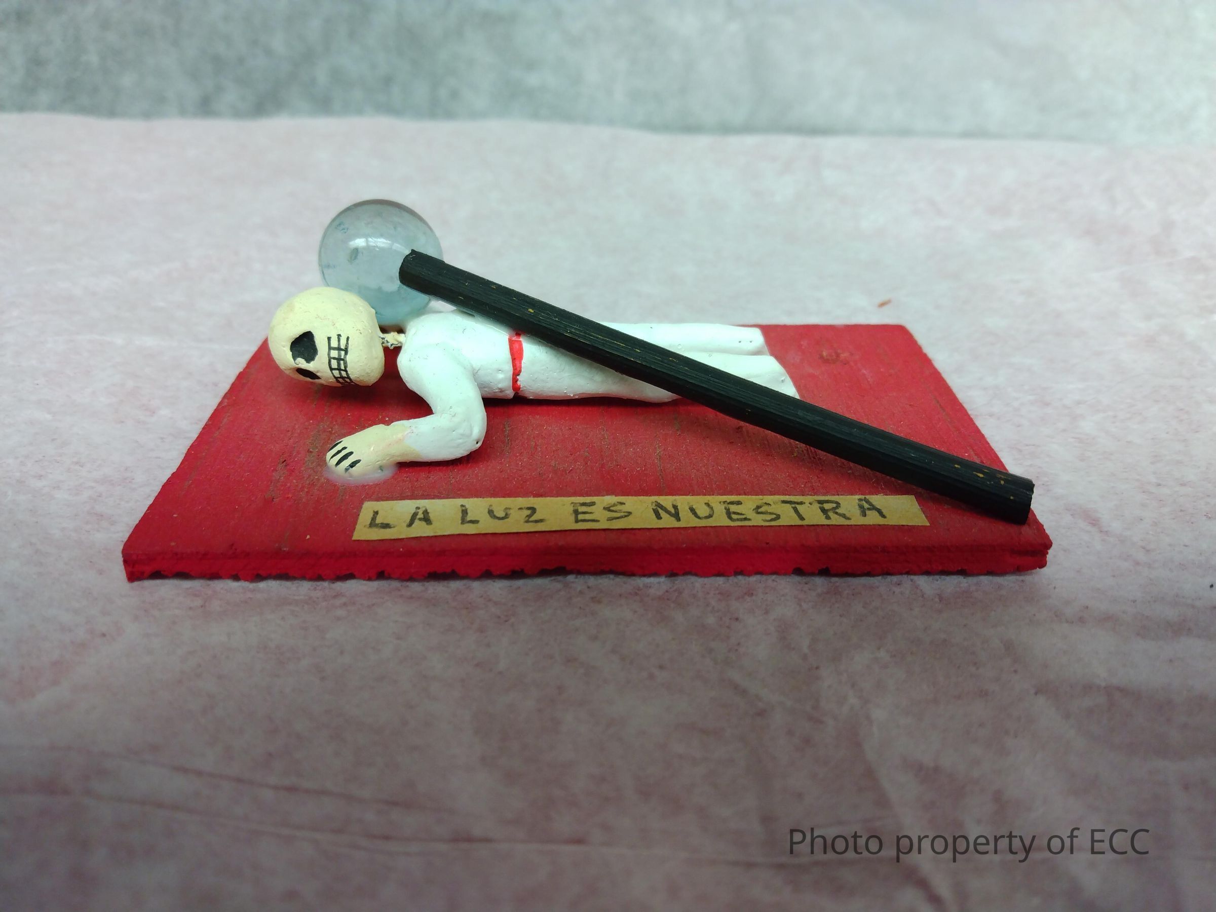 A skeleton man lays on a red base, with some type of wand, made of a glass marble and black rod, lay on top of him. A slip of paper with the words, "La luz es nuestra" in Spanish ("The light is ours" in English) is glued to the base.Collection