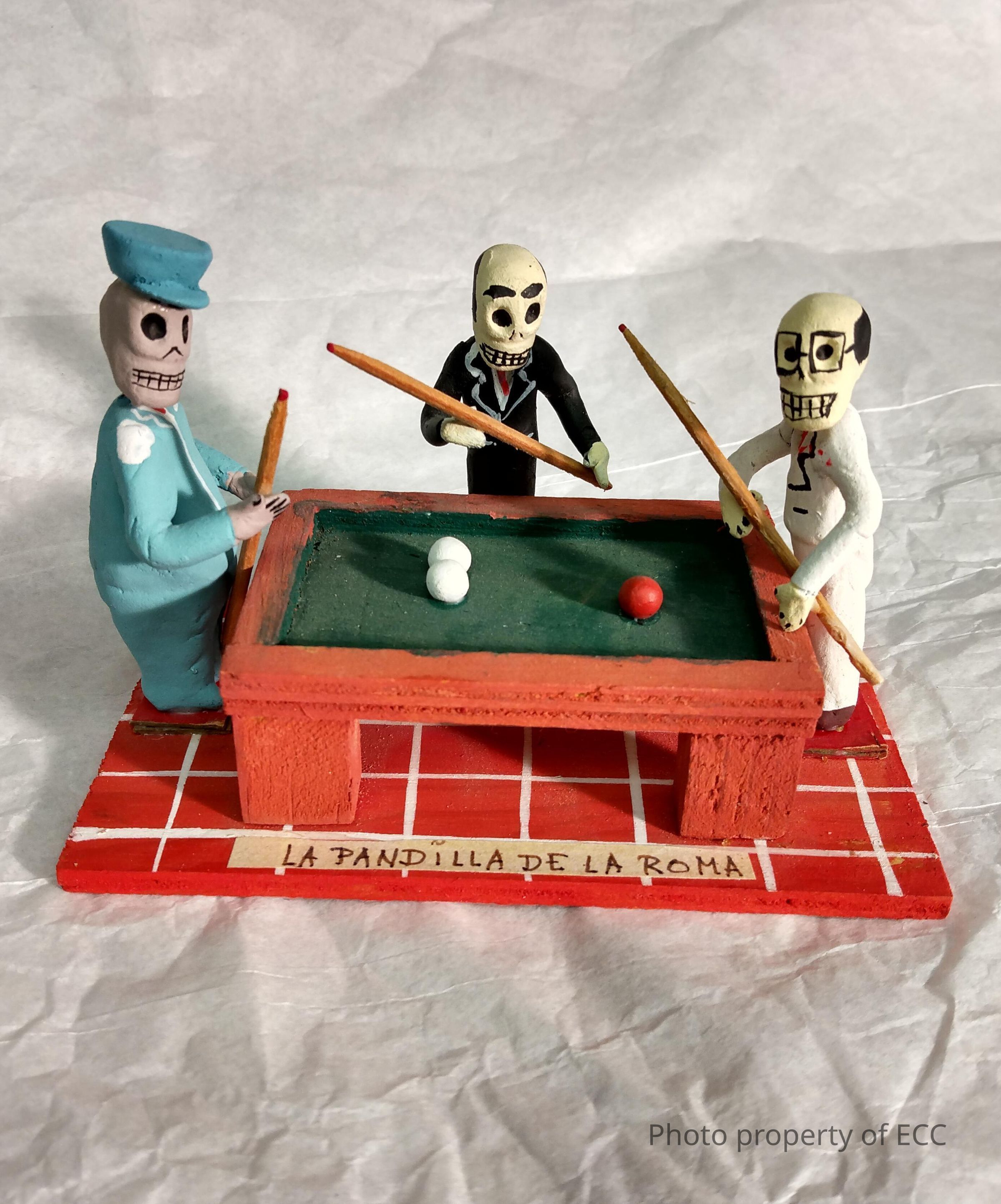 A wood and clay miniature of a pool hall scene. Three skeleton men are depicted standing on a red and white checkered floor, playing pool. All three men are dressed in suits, one light blue, one white, and the last black. Two of the men are bald, while the third, in the light blue suit, wears a hat. At the bottom is a piece of paper labeled in Spanish, "La Pandilla de La Roma", or "The Roma Gang"Collection