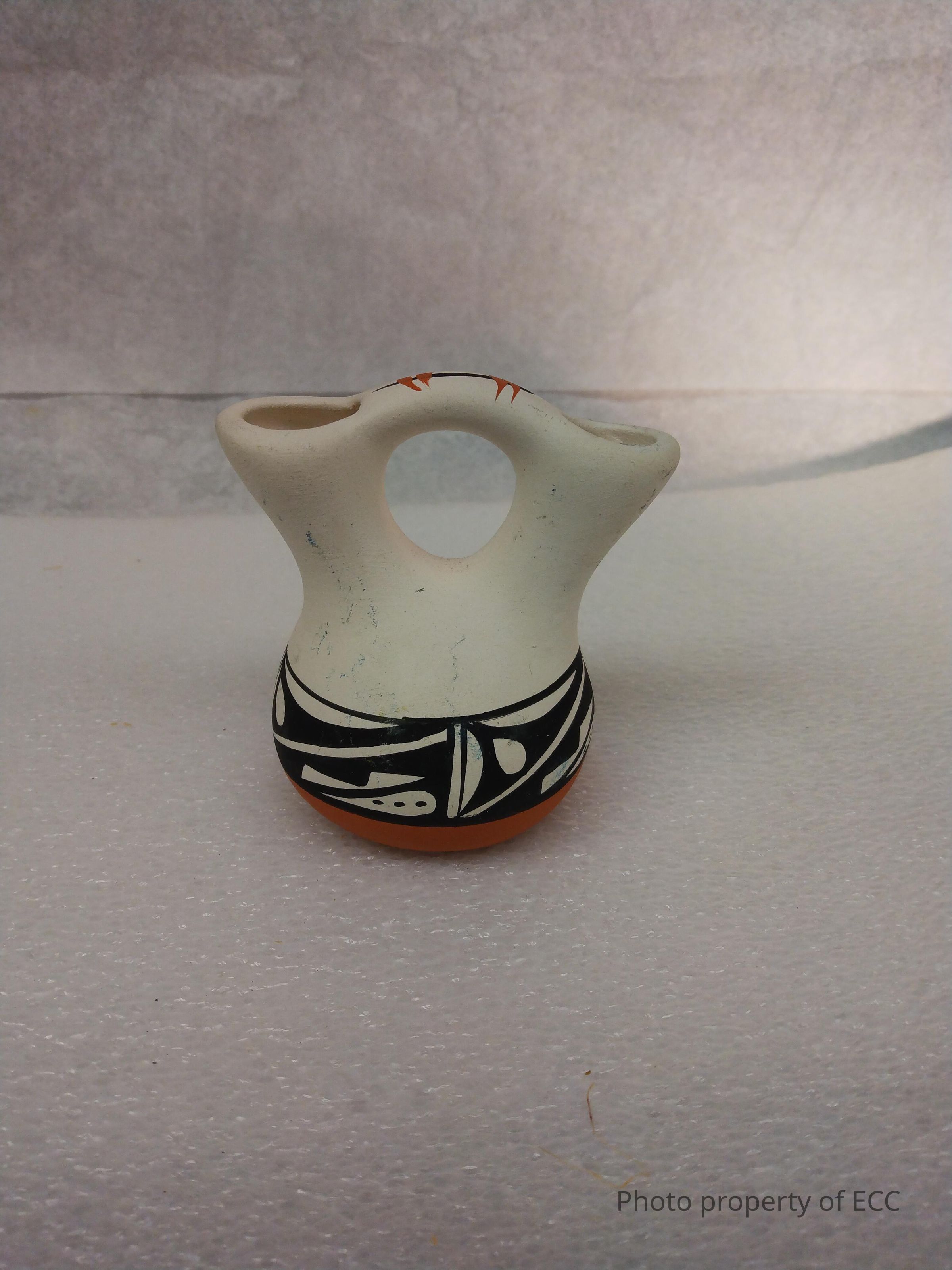 A small pot with a brown-orange base. The main body of the pot is white with black details towards the base. The pot splits into two openings with a handle connecting the them. On the handle is a design in black and red.Collection