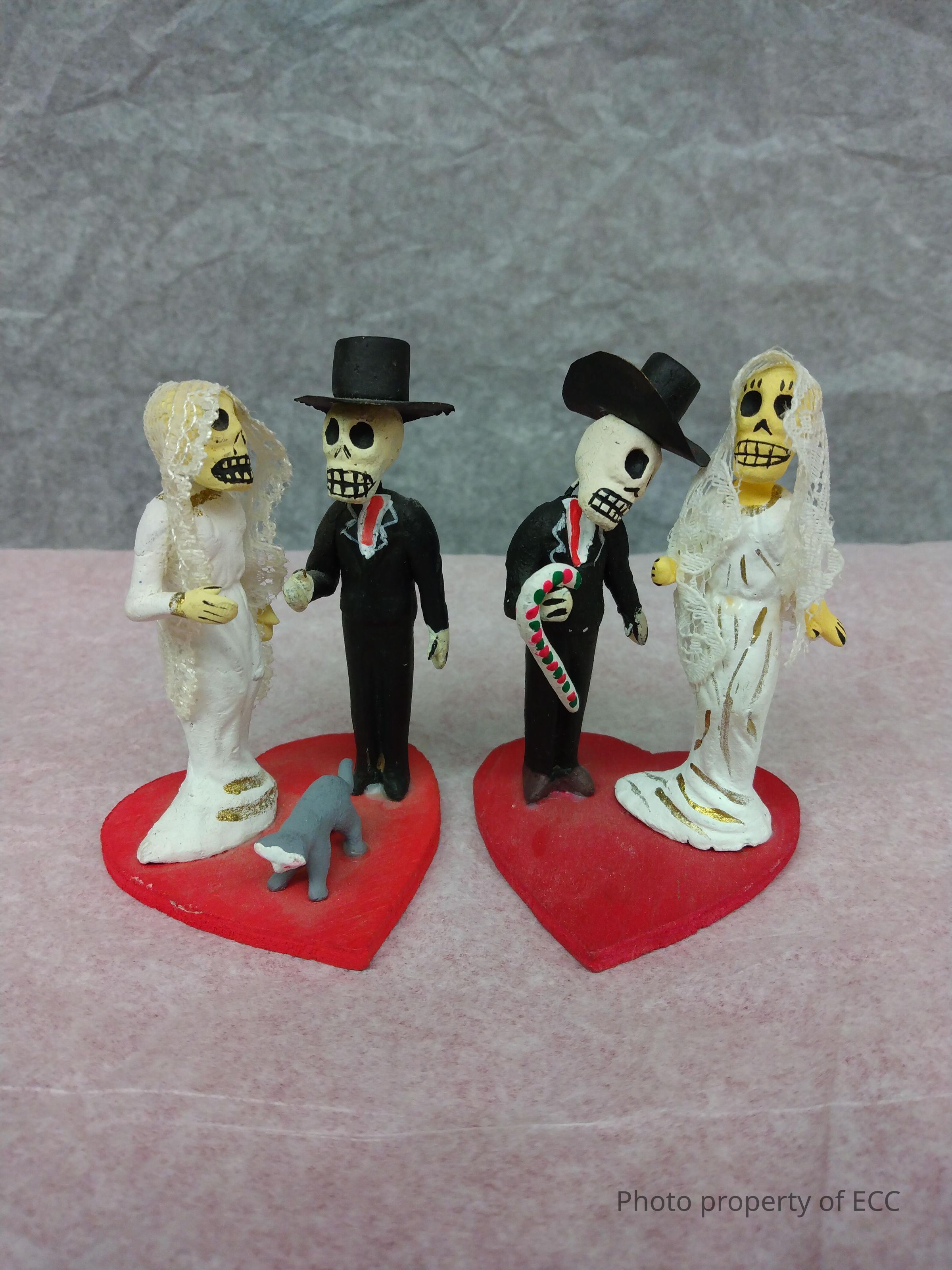 Two clay and paper mache miniatures of a wedded couple on heart shaped bases. Couple A stand together with a cat, which wears a skeleton mask for it's face. Couple B stand together, while the groom holds a white cane, which is colored with red and green dots.Collection