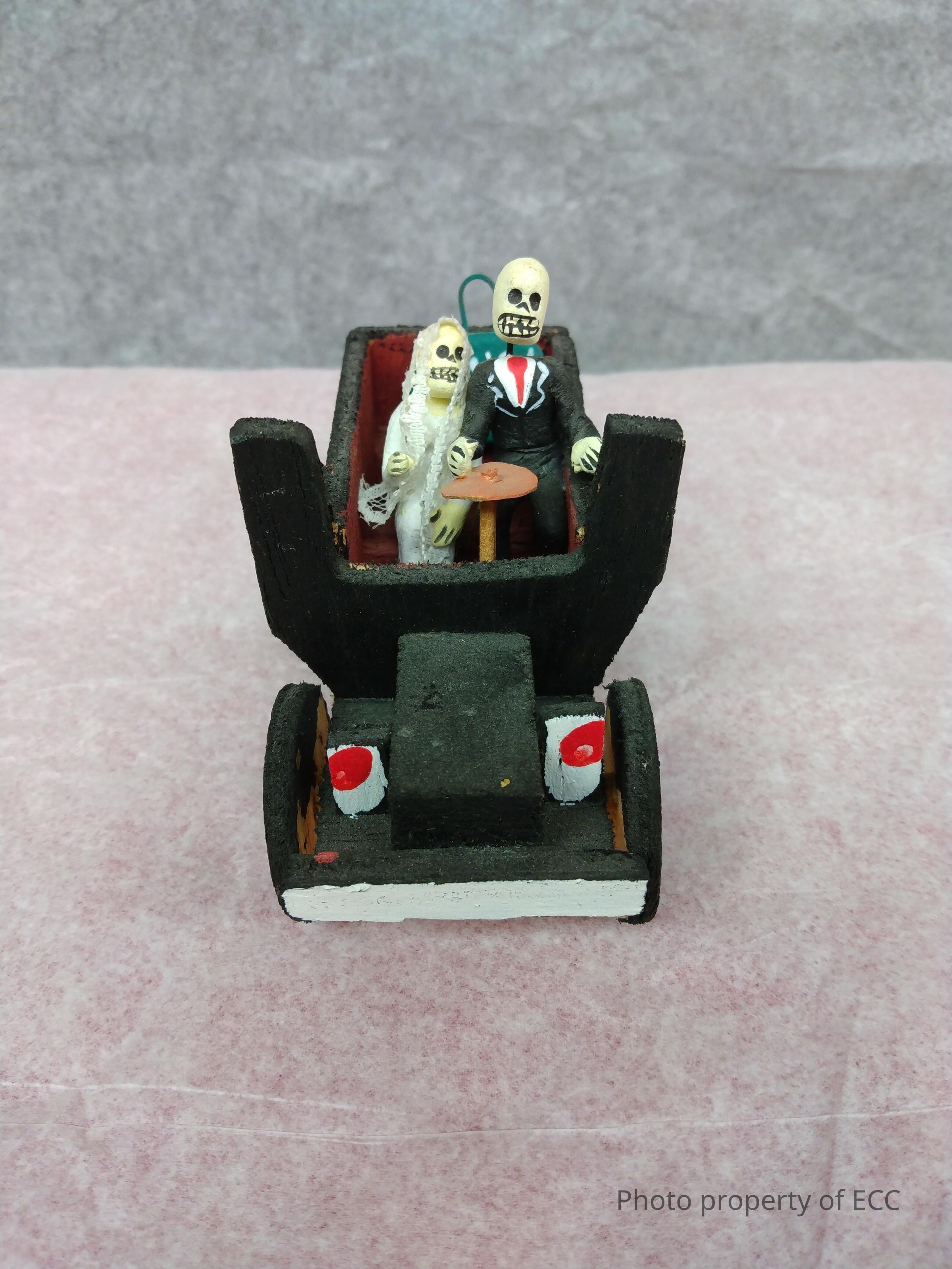 A miniature of two wedded skeletons in a black car with red and white accents. The bride and groom are dressed as such, and there is a small green plaque in the back seat with the words, "Recien casados" in Spanish, or "Just married" in English. The car does not have working wheels.Collection