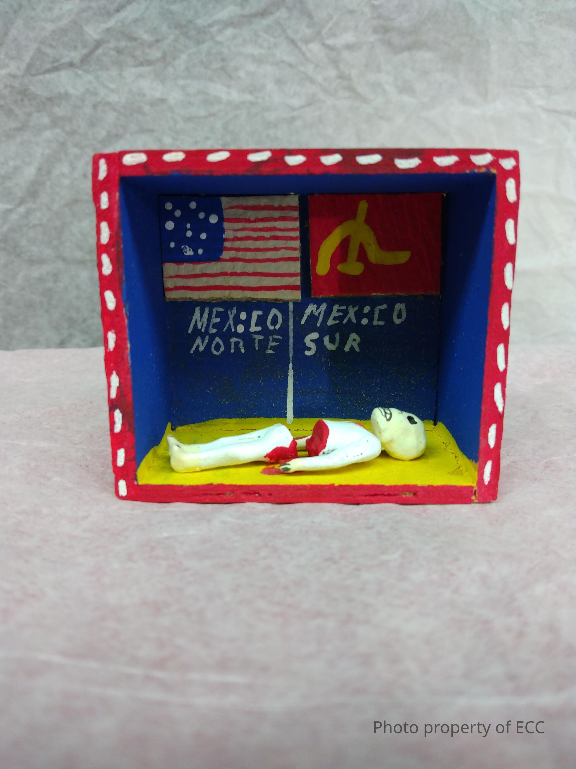 This miniature depicts a scene of a skeleton laying in a red box. He is cut in half, lying in a puddle of blood, and dressed in white. Behind him, on a blue background, is what looks to be a score board, depicting both the U.S.A and Russian flags, beneath which are the words "Mexico, Norte, Sur"Collection